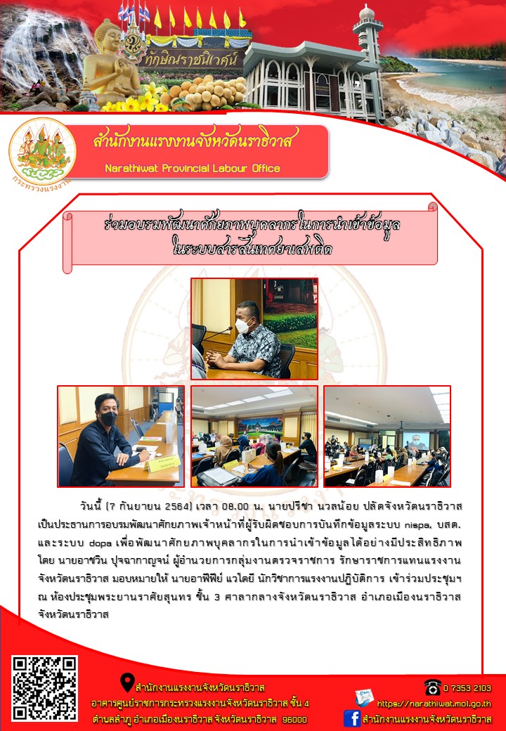 วันนี้ (7 กันยายน 2564) เวลา 08.00 น. นายปรีชา นวลน้อย ปลัดจังหวัดนราธิวาสเป็นประธานการอบรมพัฒนาศักยภาพเจ้าหน้าที่ผู้รับผิดชอบการบันทึกข้อมูลระบบ nispa, บสต.และระบบ dopa เพื่อพัฒนาศักยภาพบุคลากรในการนำเข้าข้อมูลได้อย่างมีประสิทธิภาพโดย นายอาชวิน ปุจฉากาญจน์ ผู้อำนวยการกลุ่มงานตรวจราชการ รักษาราชการแทนแรงงานจังหวัดนราธิวาส มอบหมายให้ นายอาฟีฟีย์ แวโดยี นักวิชาการแรงงานปฏิบัติการ เข้าร่วมประชุมฯ
