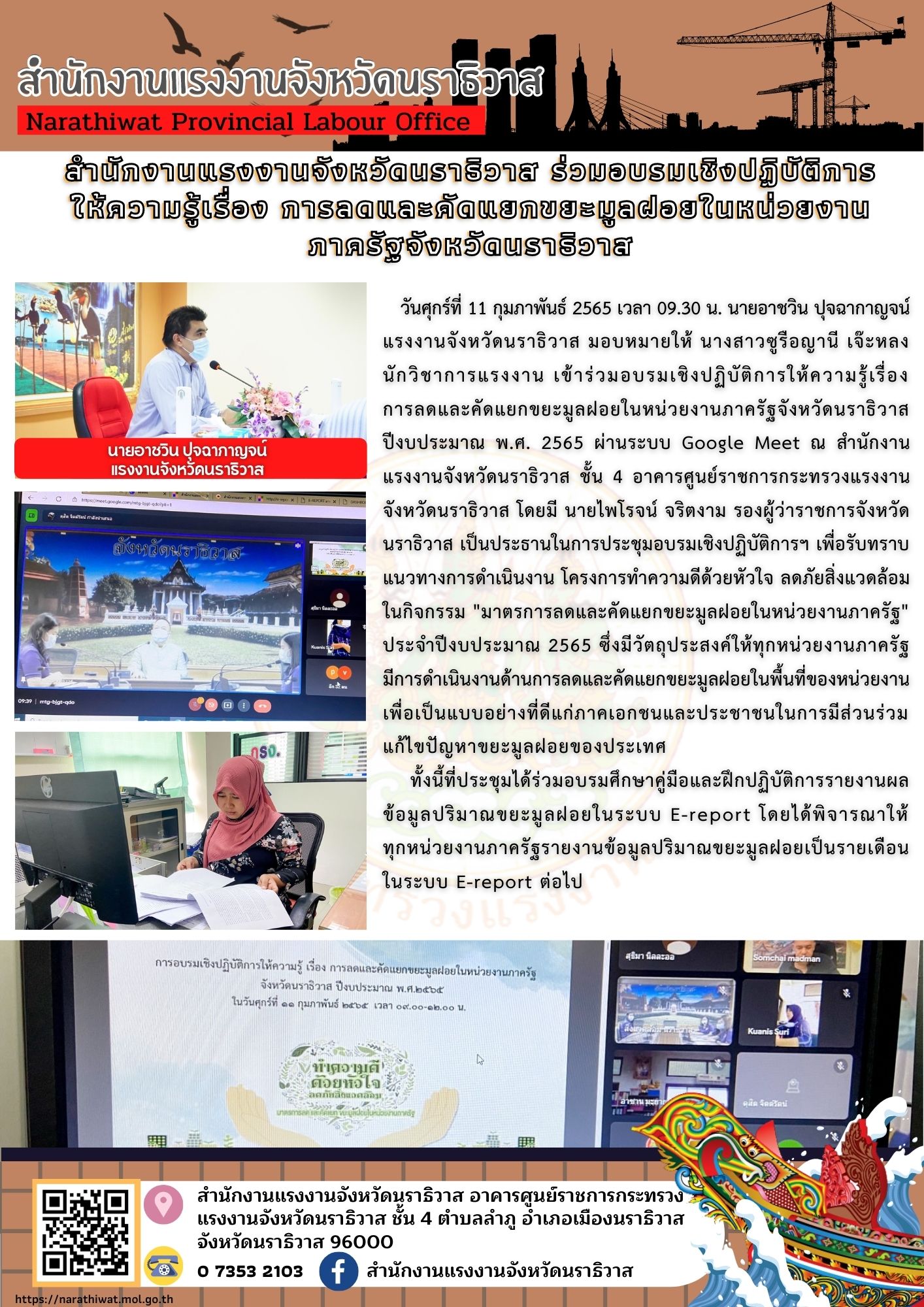 วันศุกร์ที่ 11 กุมภาพันธ์ 2565 เวลา 09.30 น. นายอาชวิน ปุจฉากาญจน์ แรงงานจังหวัดนราธิวาส มอบหมายให้ นางสาวซูรือญานี เจ๊ะหลง นักวิชาการแรงงาน เข้าร่วมอบรมเชิงปฏิบัติการให้ความรู้เรื่องการลดและคัดแยกขยะมูลฝอยในหน่วยงานภาครัฐจังหวัดนราธิวาส ปีงบประมาณ พ.ศ. 2565 ผ่านระบบ Google Meet ณ สำนักงานแรงงานจังหวัดนราธิวาส ชั้น 4 อาคารศูนย์ราชการกระทรวงแรงงานจังหวัดนราธิวาส โดยมี นายไพโรจน์ จริตงาม รองผู้ว่าราชการจังหวัดนราธิวาส เป็นประธานในการประชุมอบรมเชิงปฏิบัติการฯ เพื่อรับทราบแนวทางการดำเนินงาน โครงการทำความดีด้วยหัวใจ ลดภัยสิ่งแวดล้อมในกิจกรรม “มาตรการลดและคัดแยกขยะมูลฝอยในหน่วยงานภาครัฐ” ประจำปีงบประมาณ 2565 ซึ่งมีวัตถุประสงค์ให้ทุกหน่วยงานภาครัฐมีการดำเนินงานด้านการลดและคัดแยกขยะมูลฝอยในพื้นที่ของหน่วยงาน เพื่อเป็นแบบอย่างที่ดีแก่ภาคเอกชนและประชาชนในการมีส่วนร่วมแก้ไขปัญหาขยะมูลฝอยของประเทศ