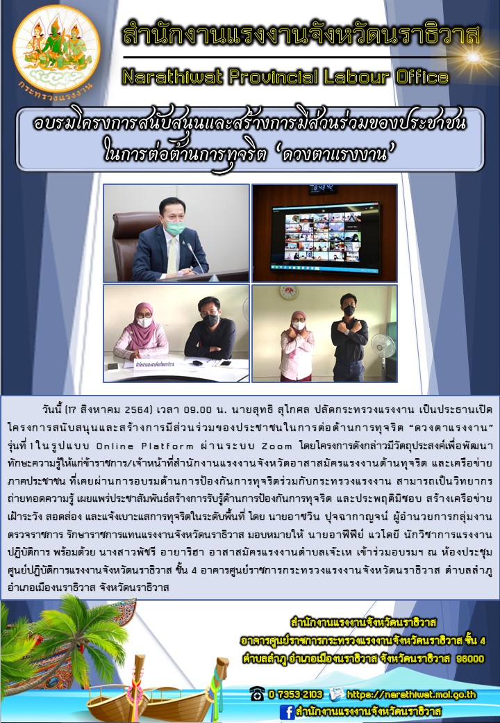 วันนี้ (17 สิงหาคม 2564) เวลา 09.00 น. นายสุทธิ สุโกศล ปลัดกระทรวงแรงงาน เป็นประธานเปิดโครงการสนับสนุนและสร้างการมีส่วนร่วมของประชาชนในการต่อต้านการทุจริต “ดวงตาแรงงาน” รุ่นที่ 1 ในรูปแบบ Online Platform ผ่านระบบ Zoom โดยโครงการดังกล่าวมีวัตถุประสงค์เพื่อพัฒนาทักษะความรู้ให้แก่ข้าราชการ/เจ้าหน้าที่สำนักงานแรงงานจังหวัดอาสาสมัครแรงงานต้านทุจริต และเครือข่ายภาคประชาชน ที่เคยผ่านการอบรมด้านการป้องกันการทุจริตร่วมกับกระทรวงแรงงาน สามารถเป็นวิทยากร