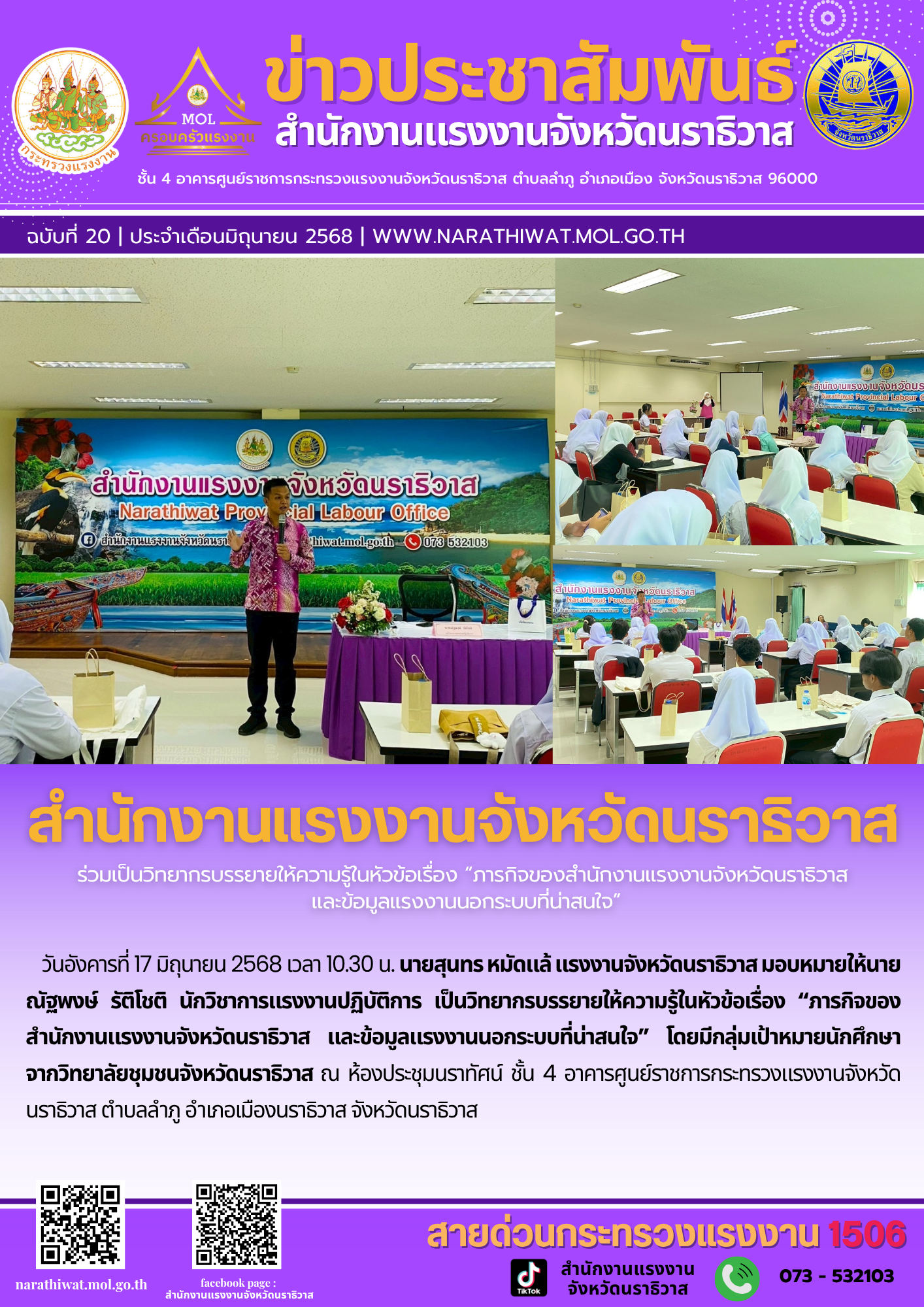 วันอังคารที่ 17 มิถุนายน 2568 เวลา 10.30 น. นายสุนทร หมัดแล้ แรงงานจังหวัดนราธิวาส มอบหมายให้นายณัฐพงษ์ รัติโชติ นักวิชาการแรงงานปฏิบัติการ เป็นวิทยากรบรรยายให้ความรู้ในหัวข้อเรื่อง “ภารกิจของสำนักงานแรงงานจังหวัดนราธิวาส และข้อมูลแรงงานนอกระบบที่น่าสนใจ” โดยมีกลุ่มเป้าหมายนักศึกษาจากวิทยาลัยชุมชนจังหวัดนราธิวาส ณ ห้องประชุมนราทัศน์ ชั้น 4 อาคารศูนย์ราชการกระทรวงแรงงานจังหวัดนราธิวาส ตำบลลำภู อำเภอเมืองนราธิวาส จังหวัดนราธิวาส
