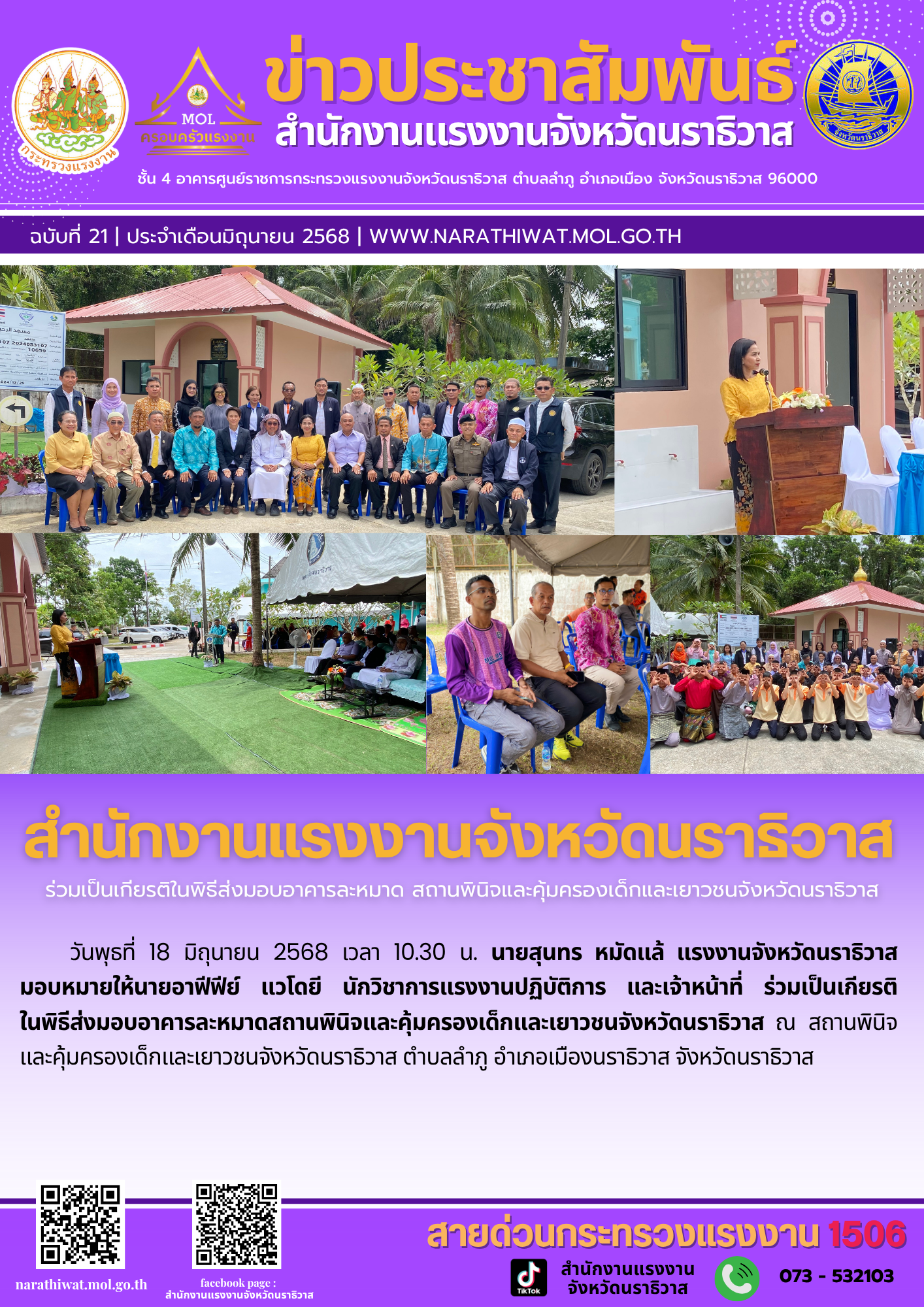 วันพุธที่ 18 มิถุนายน 2568 เวลา 10.30 น. นายสุนทร หมัดแล้ แรงงานจังหวัดนราธิวาส มอบหมายให้นายอาฟีฟีย์ แวโดยี นักวิชาการแรงงานปฏิบัติการ และเจ้าหน้าที่ ร่วมเป็นเกียรติ ในพิธีส่งมอบอาคารละหมาดสถานพินิจและคุ้มครองเด็กและเยาวชนจังหวัดนราธิวาส ณ สถานพินิจและคุ้มครองเด็กและเยาวชนจังหวัดนราธิวาส ตำบลลำภู อำเภอเมืองนราธิวาส จังหวัดนราธิวาส
