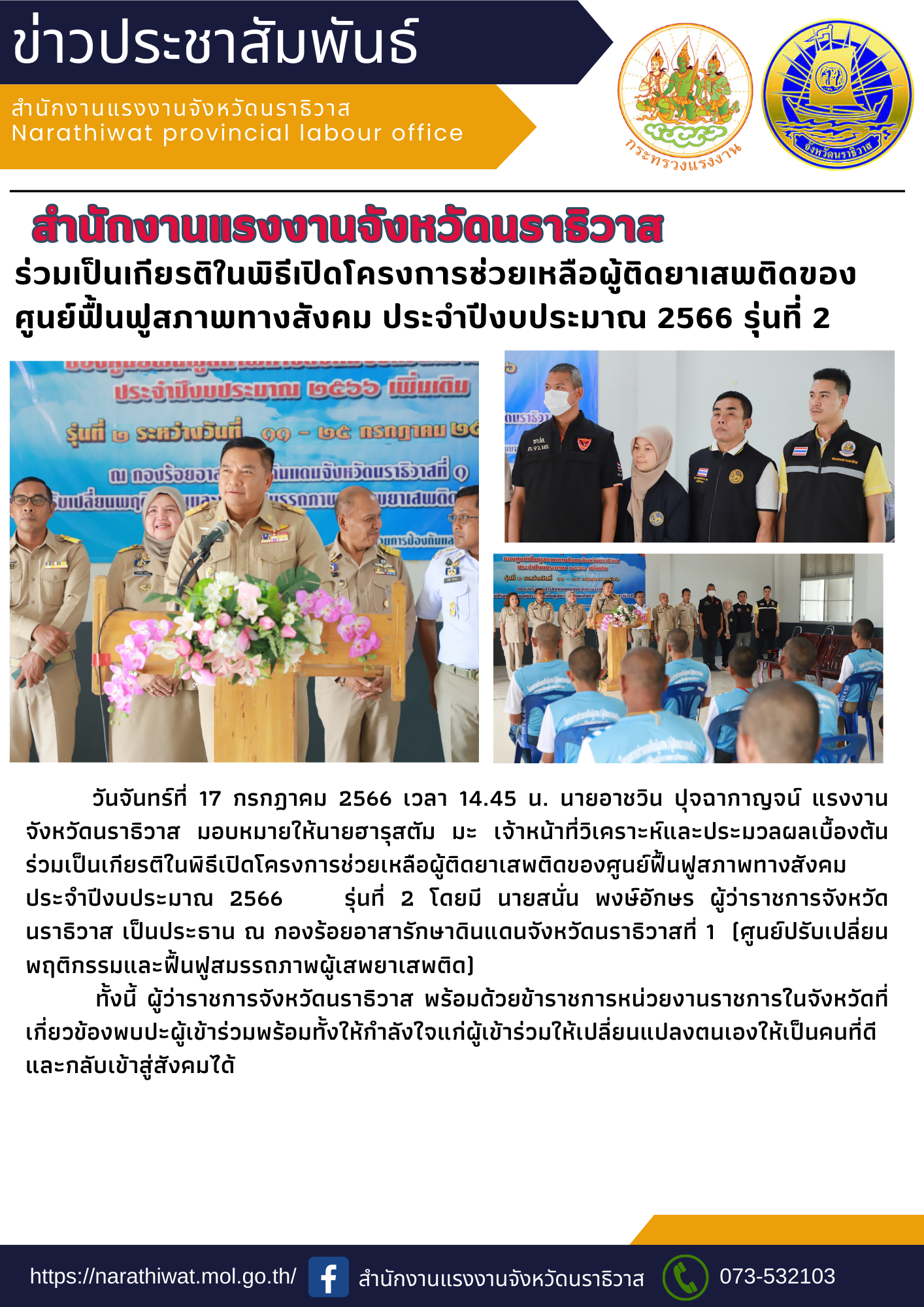 วันจันทร์ที่ 17 กรกฎาคม 2566 เวลา 14.45 น. นายอาชวิน ปุจฉากาญจน์ แรงงานจังหวัดนราธิวาส มอบหมายให้ นายฮารุสตัม มะ เจ้าหน้าที่วิเคราะห์และประมวลผลเบื้องต้น ร่วมเป็นเกียรติในพิธีเปิดโครงการช่วยเหลือผู้ติดยาเสพติดของศูนย์ฟื้นฟูสภาพทางสังคมประจำปีงบประมาณ 2566 รุ่นที่ 2 โดยมี นายสนั่น พงษ์อักษร ผู้ว่าราชการจังหวัดนราธิวาส เป็นประธาน ณ กองร้อยอาสารักษาดินแดนจังหวัดนราธิวาสที่ 1 (ศูนย์ปรับเปลี่ยนพฤติกรรมและฟื้นฟูสมรรถภาพผู้เสพยาเสพติด) ทั้งนี้ ผู้ว่าราชการจังหวัดนราธิวาส พร้อมด้วยข้าราชการหน่วยงานราชการในจังหวัดที่เกี่ยวข้องพบปะผู้เข้าร่วมพร้อมทั้งให้กำลังใจแก่ผู้เข้าร่วมให้เปลี่ยนแปลงตนเองให้เป็นคนที่ดีและกลับเข้าสู่สังคมได้