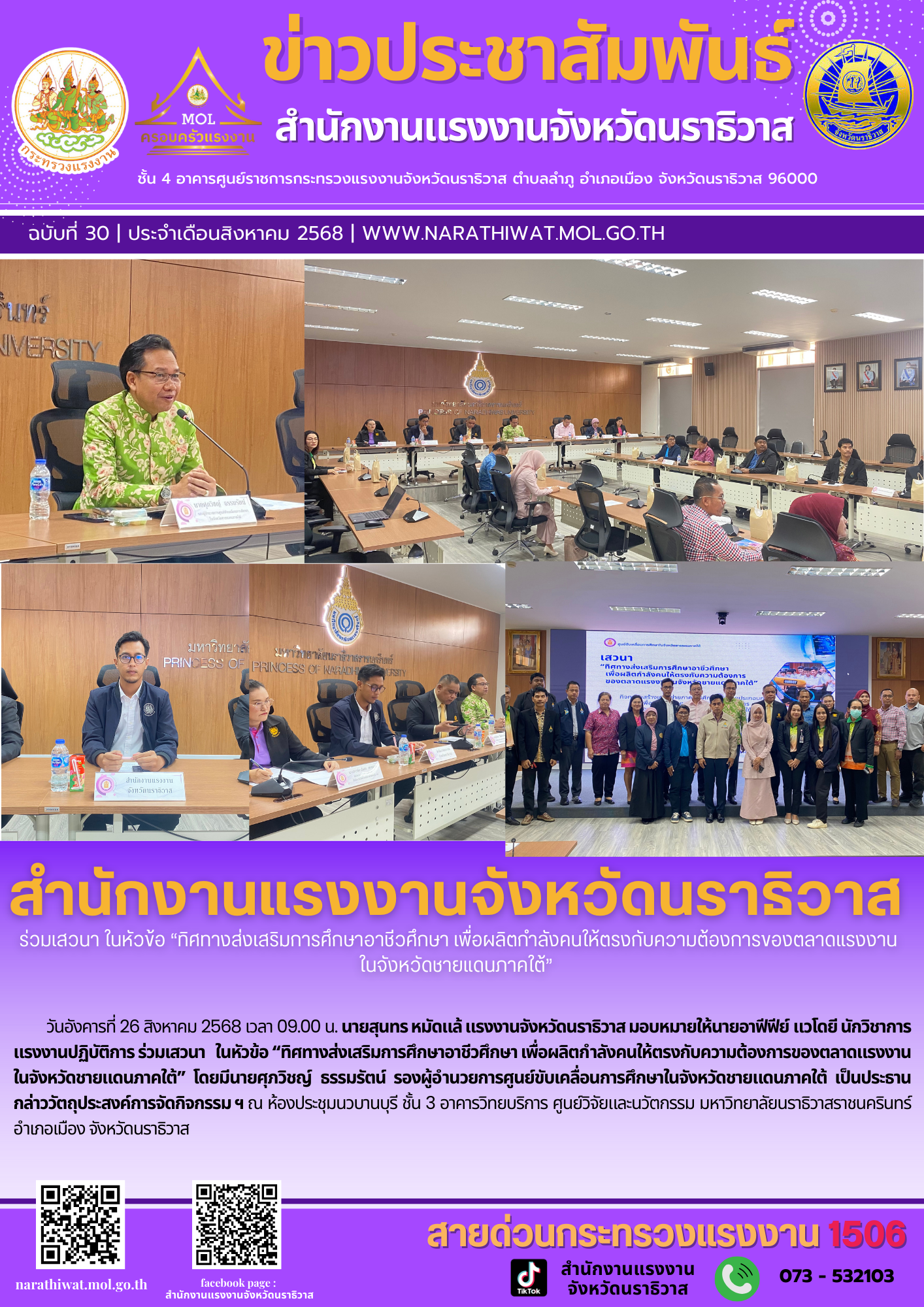 วันอังคารที่ 26 สิงหาคม 2568 เวลา 09.00 น. นายสุนทร หมัดแล้ แรงงานจังหวัดนราธิวาส มอบหมายให้นายอาฟีฟีย์ แวโดยี นักวิชาการแรงงานปฏิบัติการ ร่วมเสวนา ในหัวข้อ “ทิศทางส่งเสริมการศึกษาอาชีวศึกษา เพื่อผลิตกำลังคนให้ตรงกับความต้องการของตลาดแรงงานในจังหวัดชายแดนภาคใต้” โดยมีนายศุภวิชญ์ ธรรมรัตน์ รองผู้อำนวยการศูนย์ขับเคลื่อนการศึกษาในจังหวัดชายแดนภาคใต้ เป็นประธานกล่าววัตถุประสงค์การจัดกิจกรรม ฯ ณ ห้องประชุมนวบานบุรี ชั้น 3 อาคารวิทยบริการ ศูนย์วิจัยและนวัตกรรม มหาวิทยาลัยนราธิวาสราชนครินทร์ อำเภอเมือง จังหวัดนราธิวาส