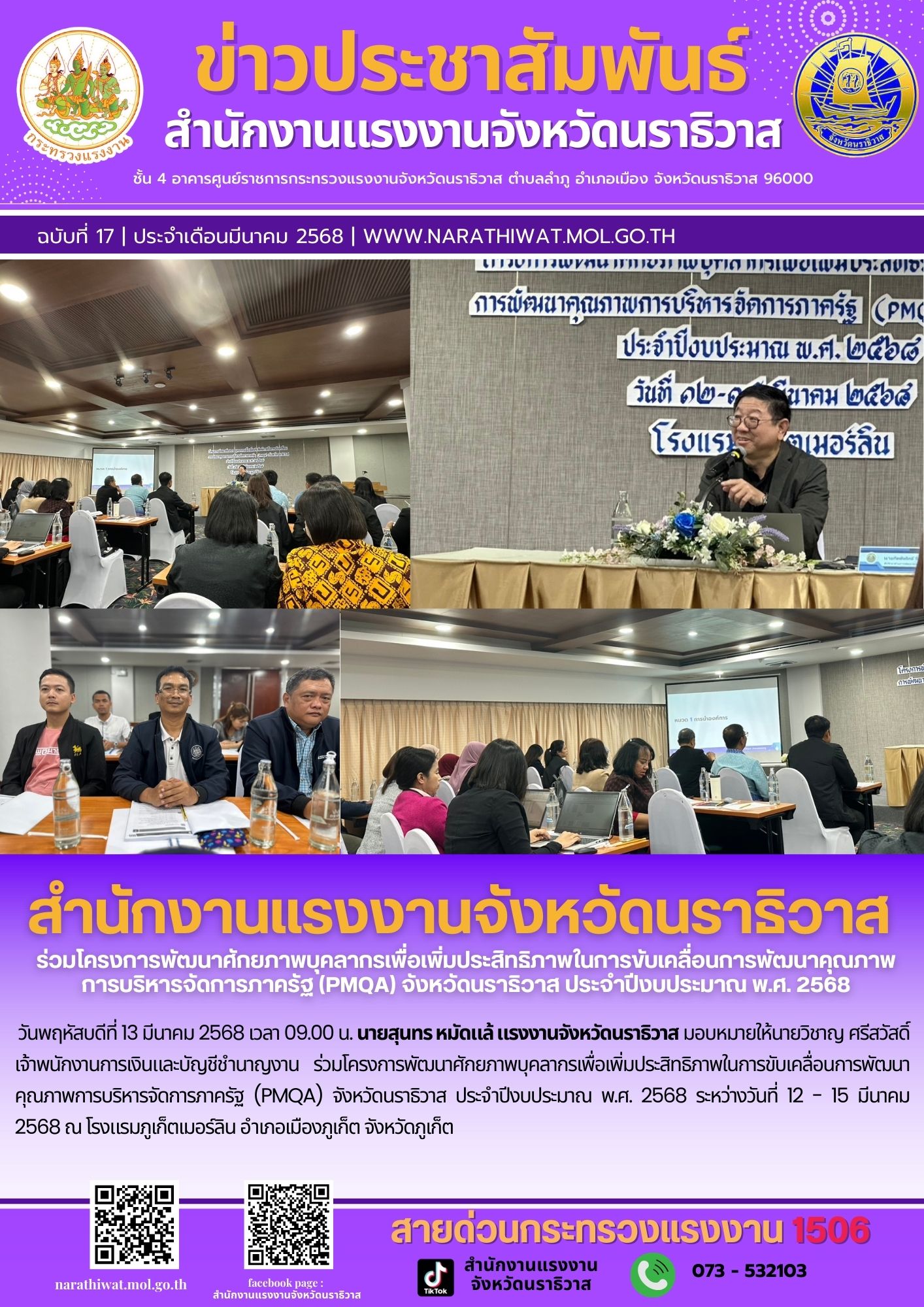 วันพฤหัสบดีที่ 13 มีนาคม 2568 เวลา 09.00 น. นายสุนทร หมัดแล้ แรงงานจังหวัดนราธิวาส มอบหมายให้นายวิชาญ ศรีสวัสดิ์ เจ้าพนักงานการเงินและบัญชีชำนาญงาน ร่วมโครงการพัฒนาศักยภาพบุคลากรเพื่อเพิ่มประสิทธิภาพในการขับเคลื่อนการพัฒนาคุณภาพการบริหารจัดการภาครัฐ (PMQA) จังหวัดนราธิวาส ประจำปีงบประมาณ พ.ศ. 2568 ระหว่างวันที่ 12 – 15 มีนาคม 2568 ณ โรงแรมภูเก็ตเมอร์ลิน อำเภอเมืองภูเก็ต จังหวัดภูเก็ต