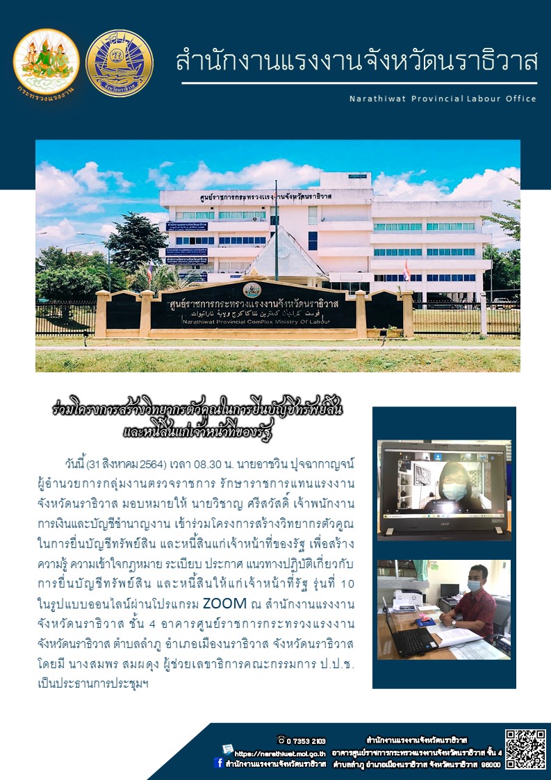 วันนี้ (31 สิงหาคม 2564) เวลา 08.30 น. นายอาชวิน ปุจฉากาญจน์ ผู้อำนวยการกลุ่มงานตรวจราชการ รักษาราชการแทนแรงงานจังหวัดนราธิวาส มอบหมายให้ นายวิชาญ ศรีสวัสดิ์ เจ้าพนักงานการเงินและบัญชีชำนาญงาน เข้าร่วมโครงการสร้างวิทยากรตัวคูณในการยื่นบัญชีทรัพย์สิน และหนี้สินแก่เจ้าหน้าที่ของรัฐ เพื่อสร้างความรู้ ความเข้าใจกฎหมาย ระเบียบ ประกาศ แนวทางปฏิบัติเกี่ยวกับการยื่นบัญชีทรัพย์สิน และหนี้สินให้แก่เจ้าหน้าที่รัฐ รุ่นที่ 10 ในรูปแบบออนไลน์ผ่านโปรแกรม ZOOM ณ สำนักงานแรงงานจังหวัดนราธิวาส ชั้น 4 อาคารศูนย์ราชการกระทรวงแรงงานจังหวัดนราธิวาส ตำบลลำภู อำเภอเมืองนราธิวาส จังหวัดนราธิวาสโดยมี นางสมพร สมผดุง ผู้ช่วยเลขาธิการคณะกรรมการ ป.ป.ช. เป็นประธานการประชุมฯ