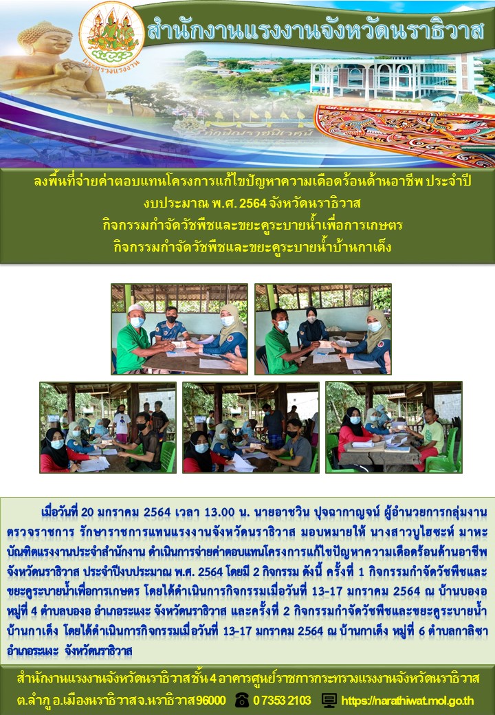 สำนักงานแรงงานจังหวัดนราธิวาส ลงพื้นที่จ่ายค่าตอบแทนโครงการแก้ไขปัญหาความเดือดร้อนด้านอาชีพ ประจำปีงบประมาณ พ.ศ. 2564 จังหวัดนราธิวาส กิจกรรมกำจัดวัชพืชและขยะคูระบายน้ำเพื่อการเกษตร กิจกรรมกำจัดวัชพืชและขยะคูระบายน้ำบ้านกาเด็ง