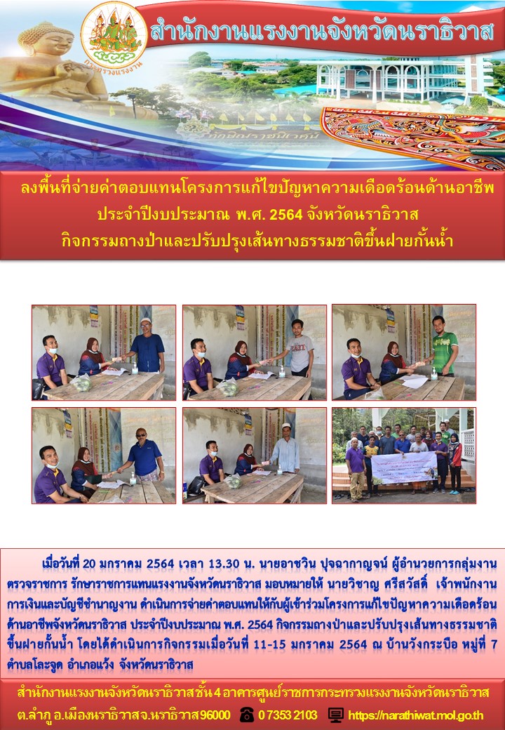 สำนักงานแรงงานจังหวัดนราธิวาส ลงพื้นที่จ่ายค่าตอบแทนโครงการแก้ไขปัญหาความเดือดร้อนด้านอาชีพ ประจำปีงบประมาณ พ.ศ. 2564 จังหวัดนราธิวาส กิจกรรมถางป่าและปรับปรุงเส้นทางธรรมชาติขึ้นฝายกั้นน้ำ