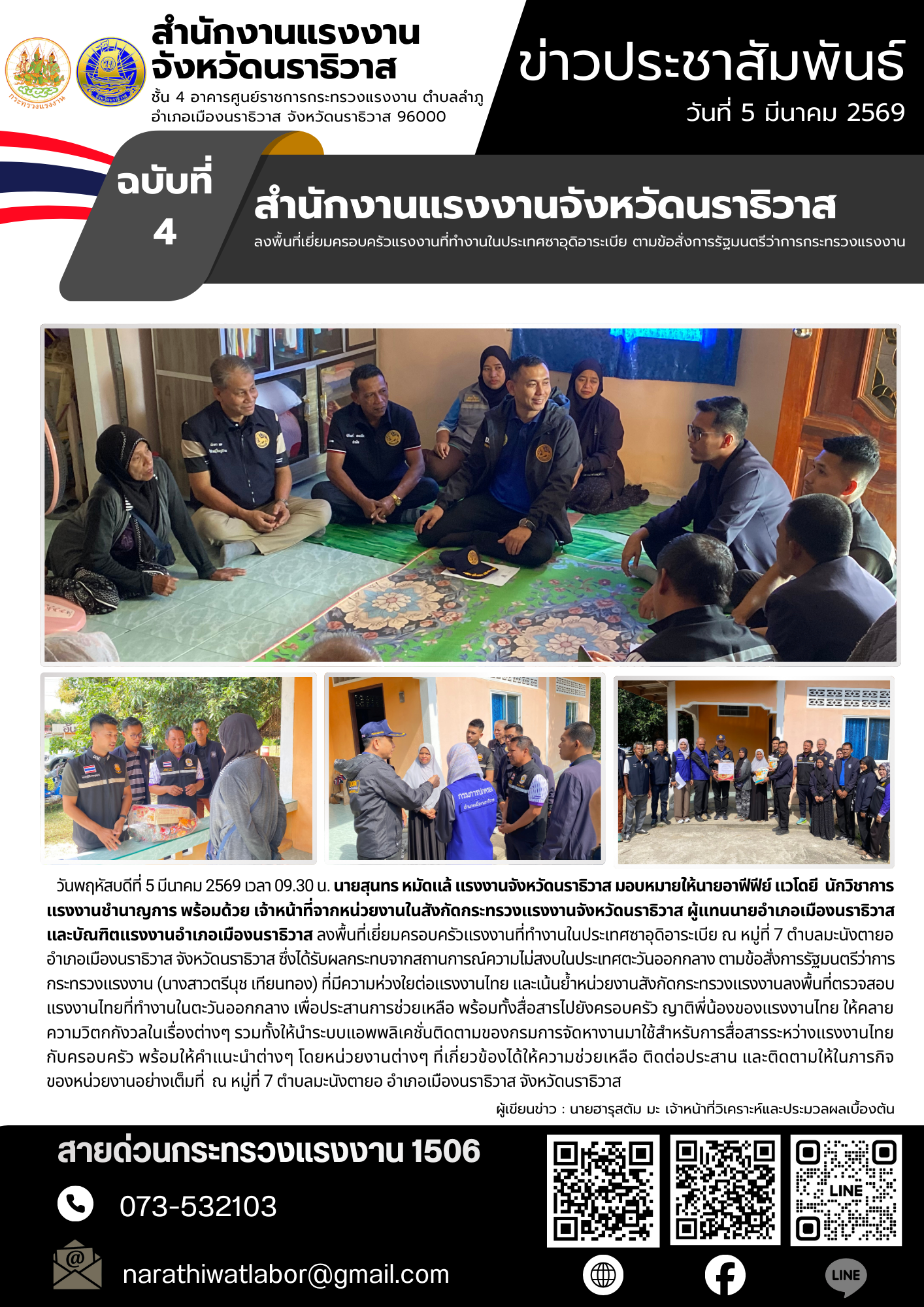 วันพฤหัสบดีที่ 5 มีนาคม 2569 เวลา 09.30 น. นายสุนทร หมัดแล้ แรงงานจังหวัดนราธิวาส มอบหมายให้นายอาฟีฟีย์ แวโดยี นักวิชาการแรงงานชำนาญการ พร้อมด้วย เจ้าหน้าที่จากหน่วยงานในสังกัดกระทรวงแรงงานจังหวัดนราธิวาส ผู้แทนนายอำเภอเมืองนราธิวาส และบัณฑิตแรงงานอำเภอเมืองนราธิวาส ลงพื้นที่เยี่ยมครอบครัวแรงงานที่ทำงานในประเทศซาอุดิอาระเบีย ณ หมู่ที่ 7 ตำบลมะนังตายอ อำเภอเมืองนราธิวาส จังหวัดนราธิวาส ซึ่งได้รับผลกระทบจากสถานการณ์ความไม่สงบในประเทศตะวันออกกลาง ตามข้อสั่งการรัฐมนตรีว่าการกระทรวงแรงงาน (นางสาวตรีนุช เทียนทอง) ที่มีความห่วงใยต่อแรงงานไทย และเน้นย้ำหน่วยงานสังกัดกระทรวงแรงงานลงพื้นที่ตรวจสอบแรงงานไทยที่ทำงานในตะวันออกกลาง เพื่อประสานการช่วยเหลือ พร้อมทั้งสื่อสารไปยังครอบครัว ญาติพี่น้องของแรงงานไทย ให้คลายความวิตกกังวลในเรื่องต่างๆ รวมทั้งให้นำระบบแอพพลิเคชั่นติดตามของกรมการจัดหางานมาใช้สำหรับการสื่อสารระหว่างแรงงานไทยกับครอบครัว พร้อมให้คำแนะนำต่างๆ โดยหน่วยงานต่างๆ ที่เกี่ยวข้องได้ให้ความช่วยเหลือ ติดต่อประสาน และติดตามให้ในภารกิจของหน่วยงานอย่างเต็มที่ ณ หมู่ที่ 7 ตำบลมะนังตายอ อำเภอเมืองนราธิวาส จังหวัดนราธิวาส