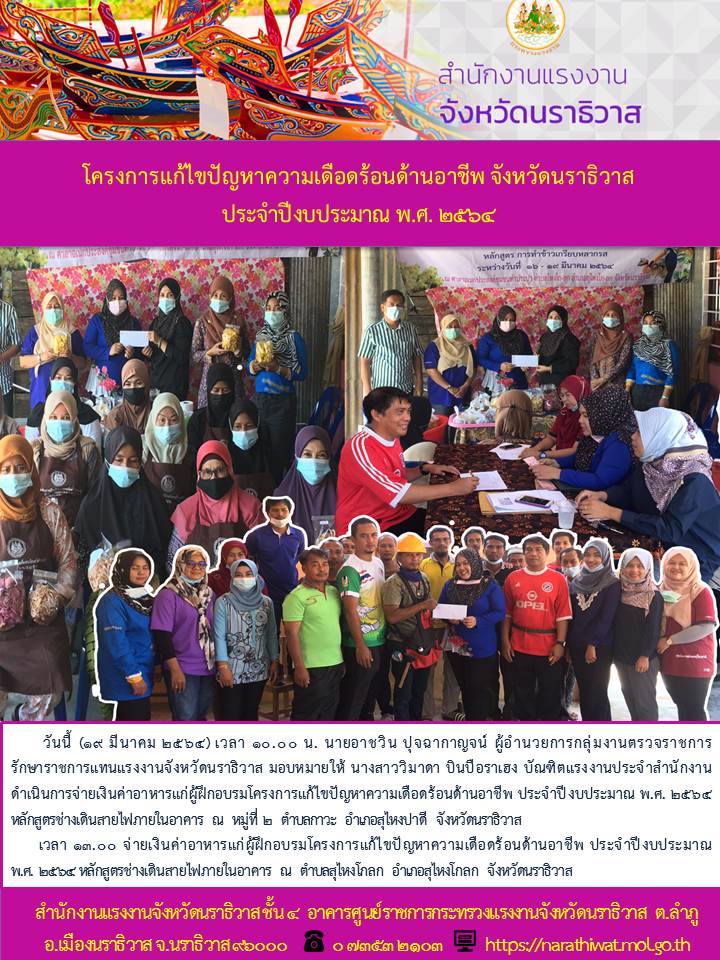 สำนักงานแรงงานจังหวัดนราธิวาส ลงพื้นที่โครงการแก้ไขปัญหาความเดือดร้อนด้านอาชีพจังหวัดนราธิวาส ประจำปีงบประมาณ พ.ศ. 2564