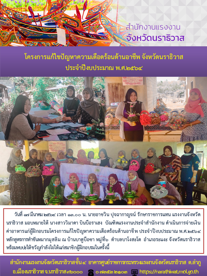 สำนักงานแรงงานจังหวัดนราธิวาส ลงพื้นที่โครงการแก้ไขปัญหาความเดือดร้อนด้านอาชีพ จังหวัดนราธิวาส ประจำปีงบประมาณ พ.ศ. 2564