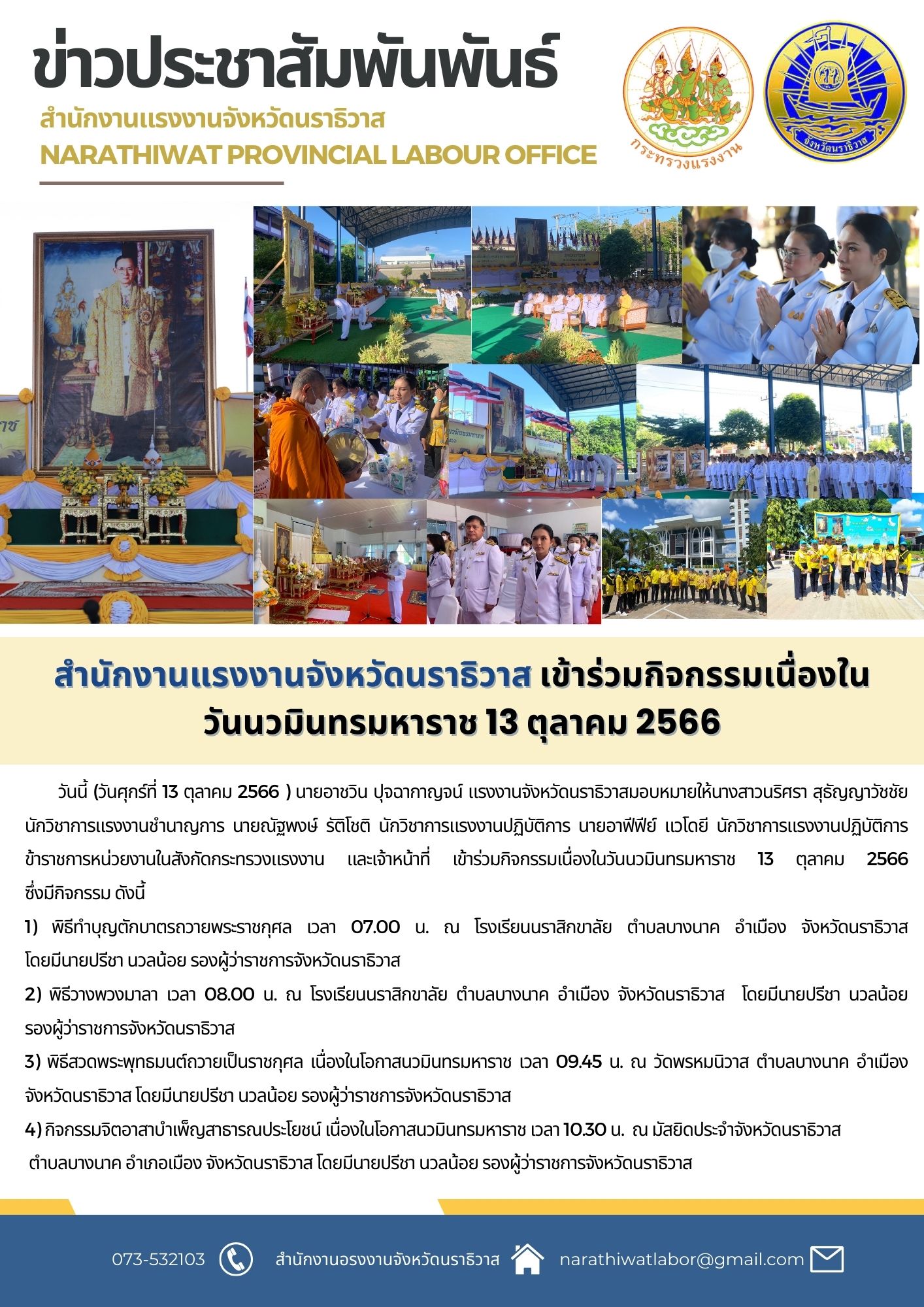 วันนี้ (วันศุกร์ที่ 13 ตุลาคม 2566 ) นายอาชวิน ปุจฉากาญจน์ แรงงานจังหวัดนราธิวาสมอบหมายให้นางสาวนริศรา สุธัญญาวัชชัย นักวิชาการแรงงานชำนาญการ นายณัฐพงษ์ รัติโชติ นักวิชาการแรงงานปฏิบัติการ นายอาฟีฟีย์ แวโดยี นักวิชาการแรงงานปฏิบัติการ ข้าราชการหน่วยงานในสังกัดกระทรวงแรงงาน และเจ้าหน้าที่ เข้าร่วมกิจกรรมเนื่องในวันนวมินทรมหาราช 13 ตุลาคม 2566 ซึ่งมีกิจกรรม ดังนี้