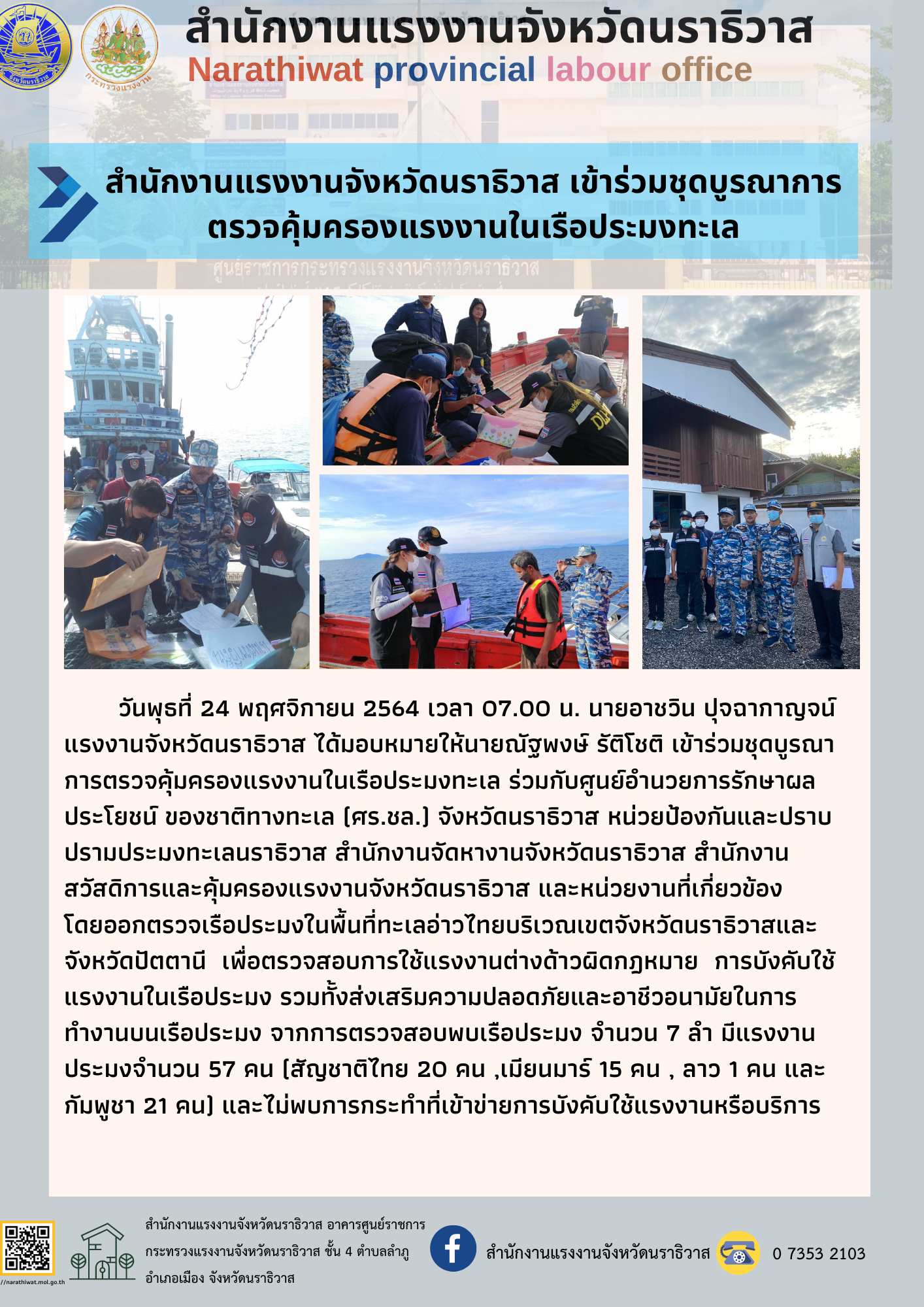 วันพุธที่ 24 พฤศจิกายน 2564 เวลา 07.00 น. นายอาชวิน ปุจฉากาญจน์ แรงงานจังหวัดนราธิวาส ได้มอบหมายให้นายณัฐพงษ์ รัติโชติ เข้าร่วมชุดบูรณาการตรวจคุ้มครองแรงงานในเรือประมงทะเล ร่วมกับศูนย์อำนวยการรักษาผลประโยชน์ ของชาติทางทะเล (ศร.ชล.) จังหวัดนราธิวาส หน่วยป้องกันและปราบปรามประมงทะเลนราธิวาส สำนักงานจัดหางานจังหวัดนราธิวาส สำนักงานสวัสดิการและคุ้มครองแรงงานจังหวัดนราธิวาส และหน่วยงานที่เกี่ยวข้อง โดยออกตรวจเรือประมงในพื้นที่ทะเลอ่าวไทยบริเวณเขตจังหวัดนราธิวาสและจังหวัดปัตตานี เพื่อตรวจสอบการใช้แรงงานต่างด้าวผิดกฎหมาย การบังคับใช้แรงงานในเรือประมง รวมทั้งส่งเสริมความปลอดภัยและอาชีวอนามัยในการทำงานบนเรือประมง จากการตรวจสอบพบเรือประมง จำนวน 7 ลำ มีแรงงานประมงจำนวน 57 คน (สัญชาติไทย 20 คน ,เมียนมาร์ 15 คน , ลาว 1 คน และกัมพูชา 21 คน) และไม่พบการกระทำที่เข้าข่ายการบังคับใช้แรงงานหรือบริการ