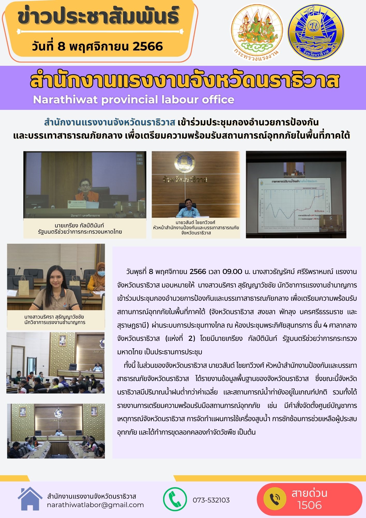 วันพุธที่ 8 พฤศจิกายน 2566 เวลา 09.00 น. นางสาวธัญรัศม์ ศรีริพราหมณ์ แรงงานจังหวัดนราธิวาส มอบหมายให้ นางสาวนริศรา สุธัญญาวัชชัย นักวิชาการแรงงานชำนาญการ เข้าร่วมประชุมกองอำนวยการป้องกันและบรรเทาสาธารณภัยกลาง เพื่อเตรียมความพร้อมรับสถานการณ์อุทกภัยในพื้นที่ภาคใต้ (จังหวัดนราธิวาส สงขลา พัทลุง นครศรีธรรมราช และ สุราษฎธานี) ผ่านระบบการประชุมทางไกล ณ ห้องประชุมพระภิศัยสุนทรการ ชั้น 4 ศาลากลางจังหวัดนราธิวาส (แห่งที่ 2) โดยมีนายเกรียง กัลป์ตินันท์ รัฐมนตรีช่วยว่าการกระทรวงมหาดไทย เป็นประธานการประชุม ทั้งนี้ ในส่วนของจังหวัดนราธิวาส นายวสันต์ ไชยทวีวงศ์ หัวหน้าสำนักงานป้องกันและบรรเทาสาธารณภัยจังหวัดนราธิวาส ได้รายงานข้อมูลพื้นฐานของจังหวัดนราธิวาส ซึ่งขณะนี้จังหวัดนราธิวาสมีปริมาณน้ำฝนต่ำกว่าค่าเฉลี่ย และสถานการณ์น้ำท่ายังอยู่ในเกณฑ์ปกติ รวมทั้งได้รายงานการเตรียมความพร้อมรับมือสถานการณ์อุทกภัย เช่น มีคำสั่งจัดตั้งศูนย์บัญชาการเหตุการณ์จังหวัดนราธิวาส การจัดทำแผนการใช้เครื่องสูบน้ำ การซักซ้อมการช่วยเหลือผู้ประสบอุทกภัย และได้ทำการขุดลอกคลองกำจัดวัชพืช เป็นต้น
