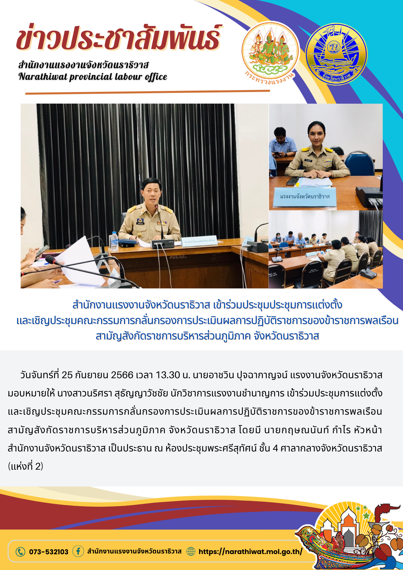 วันจันทร์ที่ 25 กันยายน 2566 เวลา 13.30 น. นายอาชวิน ปุจฉากาญจน์ แรงงานจังหวัดนราธิวาส มอบหมายให้ นางสาวนริศรา สุธัญญาวัชชัย นักวิชาการแรงงานชำนาญการ เข้าร่วมประชุมการแต่งตั้งและเชิญประชุมคณะกรรมการกลั่นกรองการประเมินผลการปฏิบัติราชการของข้าราชการพลเรือนสามัญสังกัดราชการบริหารส่วนภูมิภาค จังหวัดนราธิวาส โดยมี นายกฤษณนันท์ กำไร หัวหน้าสำนักงานจังหวัดนราธิวาส เป็นประธาน ณ ห้องประชุมพระศรีสุทัศน์ ชั้น 4 ศาลากลางจังหวัดนราธิวาส (แห่งที่ 2)