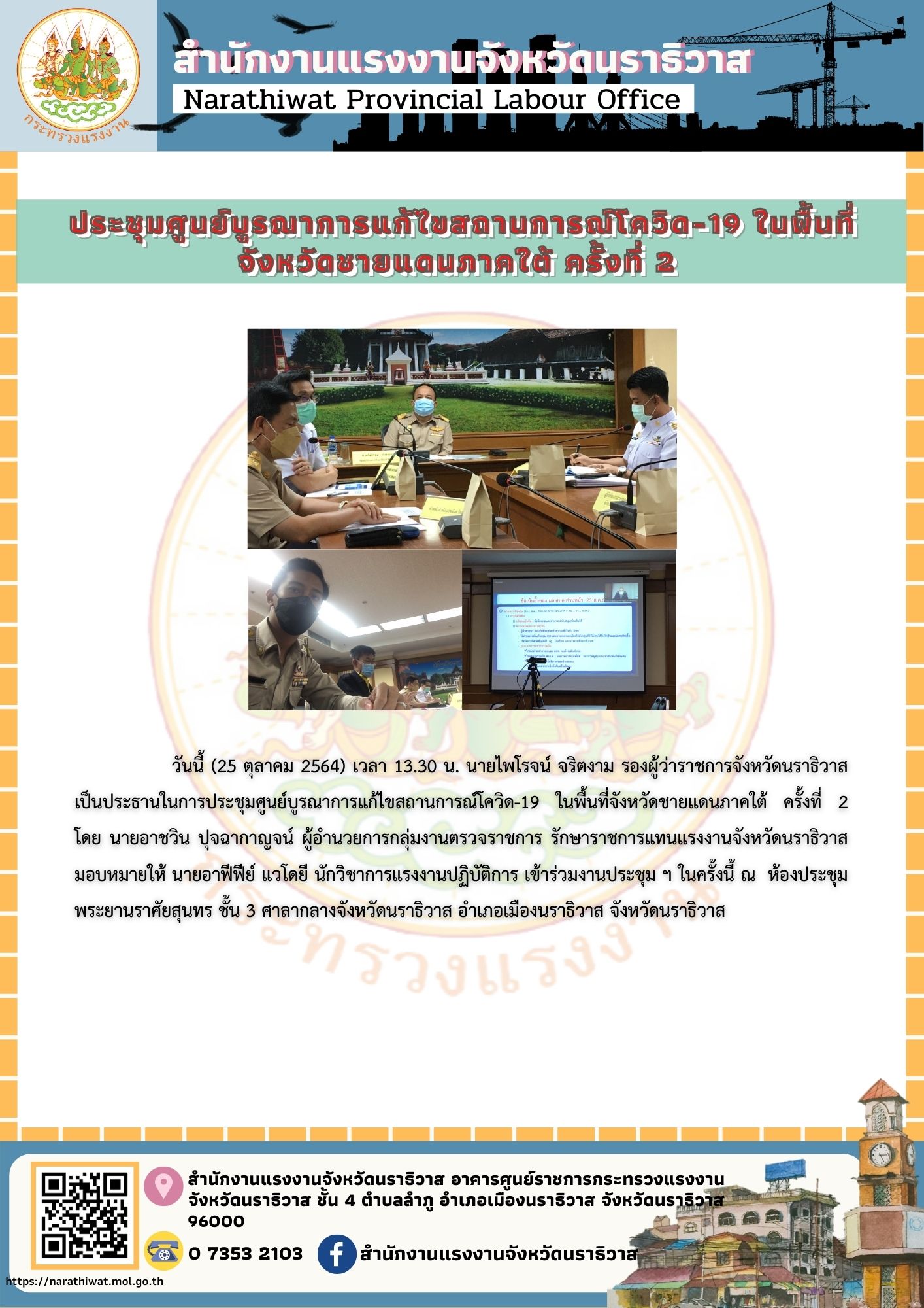 วันนี้ (25 ตุลาคม 2564) เวลา 13.30 น. นายไพโรจน์ จริตงาม รองผู้ว่าราชการจังหวัดนราธิวาส เป็นประธานในการประชุมศูนย์บูรณาการแก้ไขสถานการณ์โควิด-19 ในพื้นที่จังหวัดชายแดนภาคใต้ ครั้งที่ 2 โดย นายอาชวิน ปุจฉากาญจน์ ผู้อำนวยการกลุ่มงานตรวจราชการ รักษาราชการแทนแรงงานจังหวัดนราธิวาส มอบหมายให้ นายอาฟีฟีย์ แวโดยี นักวิชาการแรงงานปฏิบัติการ เข้าร่วมงานประชุม ฯ ในครั้งนี้ ณ ห้องประชุมพระยานราศัยสุนทร ชั้น 3 ศาลากลางจังหวัดนราธิวาส อำเภอเมืองนราธิวาส จังหวัดนราธิวาส
