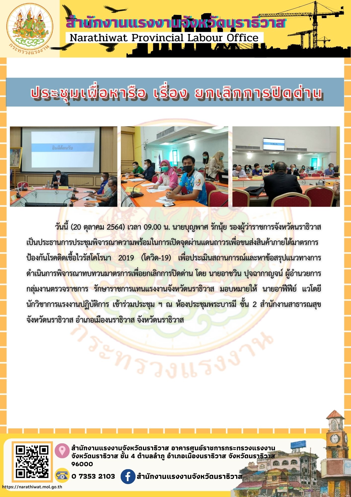 วันนี้ (20 ตุลาคม 2564) เวลา 09.00 น. นายบุญพาศ รักนุ้ย รองผู้ว่าราชการจังหวัดนราธิวาส เป็นประธานการประชุมพิจารณาความพร้อมในการเปิดจุดผ่านแดนถาวรเพื่อขนส่งสินค้าภายใต้มาตรการป้องกันโรคติดเชื้อไวรัสโคโรนา 2019 (โควิด-19) เพื่อประเมินสถานการณ์และหาข้อสรุปแนวทางการดำเนินการพิจารณาทบทวนมาตรการเพื่อยกเลิกการปิดด่าน โดย นายอาชวิน ปุจฉากาญจน์ ผู้อำนวยการกลุ่มงานตรวจราชการ รักษาราชการแทนแรงงานจังหวัดนราธิวาส มอบหมายให้ นายอาฟีฟีย์ แวโดยี นักวิชาการแรงงานปฏิบัติการ เข้าร่วมประชุม ฯ ณ ห้องประชุมพระบารมี ชั้น 2 สำนักงานสาธารณสุขจังหวัดนราธิวาส อำเภอเมืองนราธิวาส จังหวัดนราธิวาส