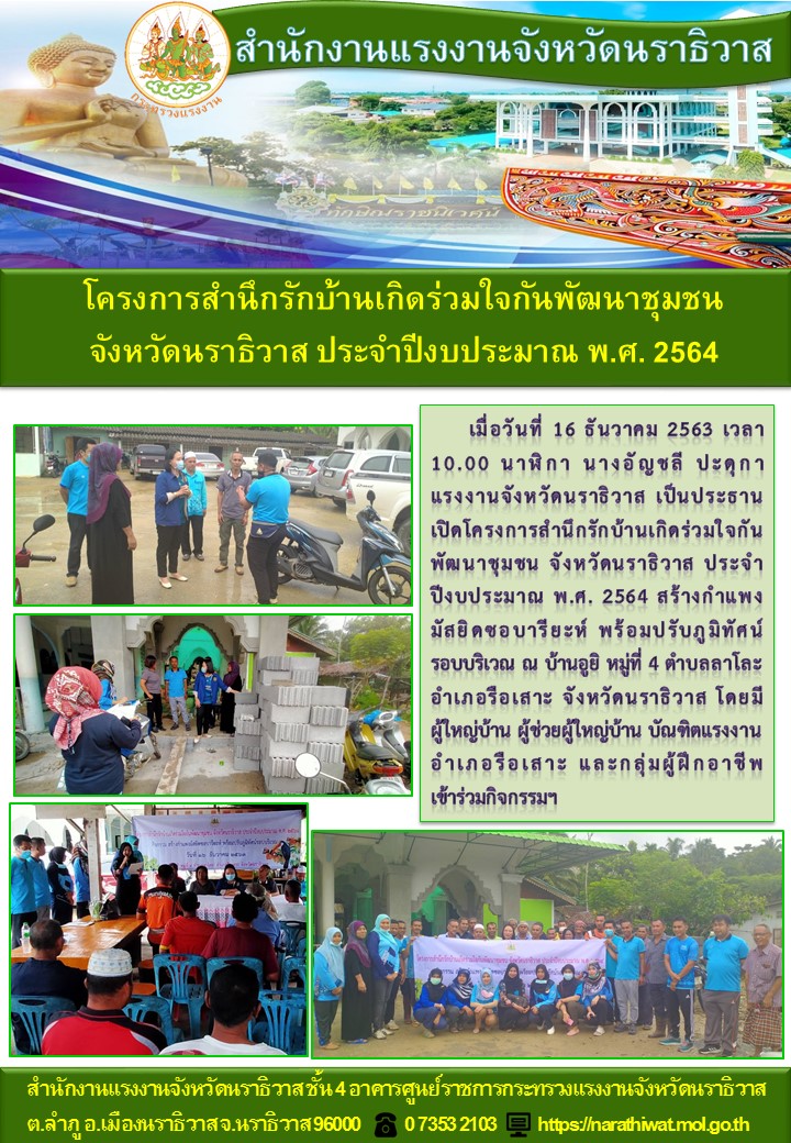 สำนักงานแรงงานจังหวัดนราธิวาส โครงการสำนึกรักบ้านเกิดร่วมใจกันพัฒนาชุมชน จังหวัดนราธิวาส ประจำปีงบประมาณ พ.ศ. 2564 สร้างกำแพงมัสยิดซอบารียะห์ พร้อมปรับภูมิทัศน์รอบบริเวณ