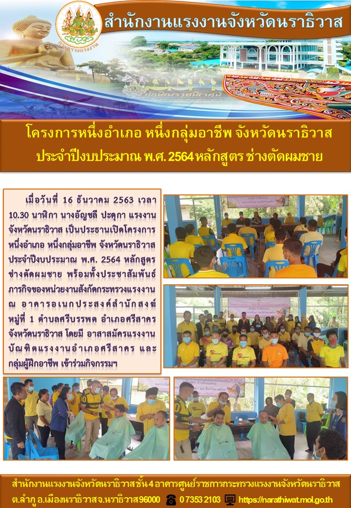 สำนักงานแรงงานจังหวัดนราธิวาส โครงการหนึ่งอำเภอ หนึ่งกลุ่มอาชีพ จังหวัดนราธิวาส ประจำปีงบประมาณ พ.ศ. 2564 หลักสูตร ช่างตัดผมชาย ณ อาคารอเนกประสงค์สำนักสงฆ์ หมู่ที่ 1 ตำบลศรีบรรพต อำเภอศรีสาคร จังหวัดนราธิวาส