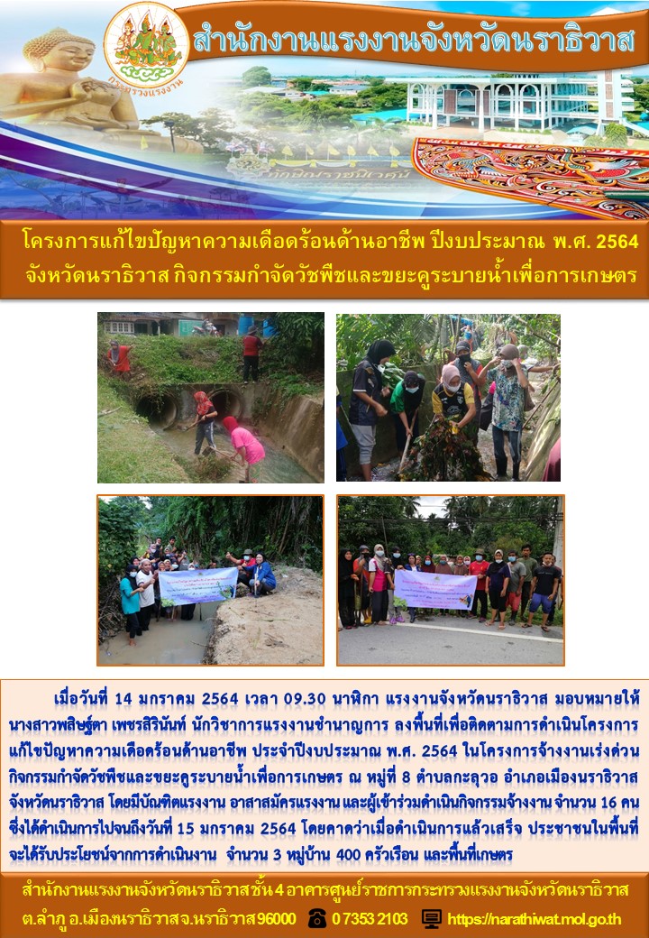 สำนักงานแรงงานจังหวัดนราธิวาส โครงการแก้ไขปัญหาความเดือดร้อนด้านอาชีพ ปีงบประมาณ พ.ศ. 2564 จังหวัดนราธิวาส กิจกรรมกำจัดวัชพืชและขยะคูระบายน้ำเพื่อการเกษตร