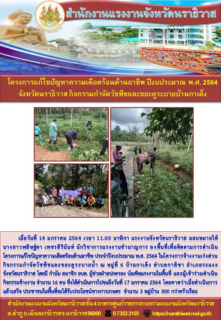 สำนักงานแรงงานจังหวัดนราธิวาส โครงการแก้ไขปัญหาความเดือดร้อนด้านอาชีพ ปีงบประมาณ พ.ศ. 2564 จังหวัดนราธิวาส กิจกรรมกำจัดวัชพืชและขยะคูระบายบ้านกาเด็ง