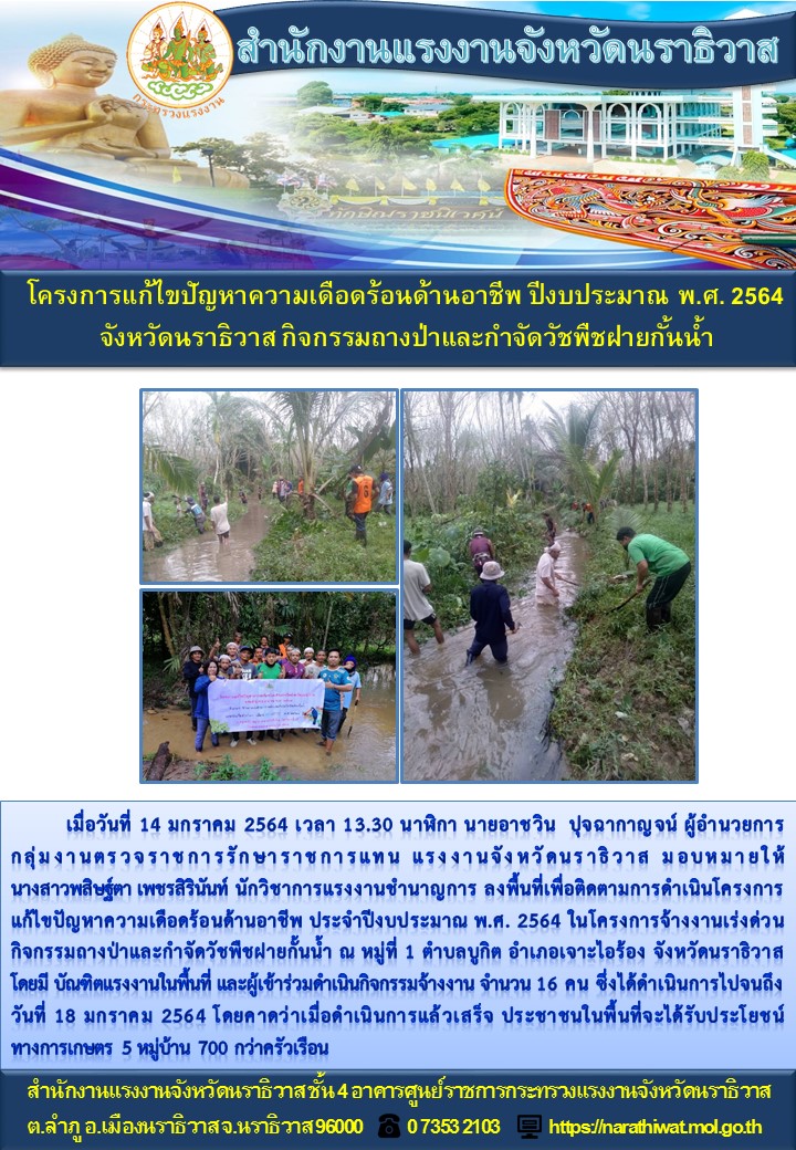 สำนักงานแรงงานจังหวัดนราธิวาส โครงการแก้ไขปัญหาความเดือดร้อนด้านอาชีพ ปีงบประมาณ พ.ศ. 2564 จังหวัดนราธิวาส กิจกรรมถางป่าและกำจัดวัชพืชฝายกั้นน้ำ