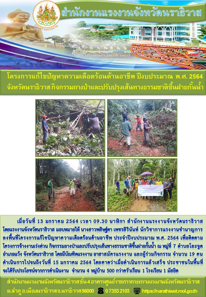 สำนักงานแรงงานจังหวัดนราธิวาส โครงการแก้ไขปัญหาความเดือดร้อนด้านอาชีพ ปีงบประมาณ พ.ศ. 2564 จังหวัดนราธิวาส กิจกรรมถางป่าและปรับปรุงเส้นทางธรรมชาติขึ้นฝายกั้นน้ำ