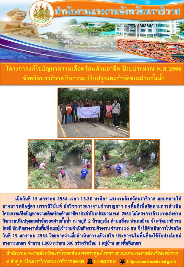 สำนักงานแรงงานจังหวัดนราธิวาส โครงการแก้ไขปัญหาความเดือดร้อนด้านอาชีพ ปีงบประมาณ พ.ศ. 2564 จังหวัดนราธิวาส กิจกรรมปรับปรุงและกำจัดขยะฝายกั้นน้ำ