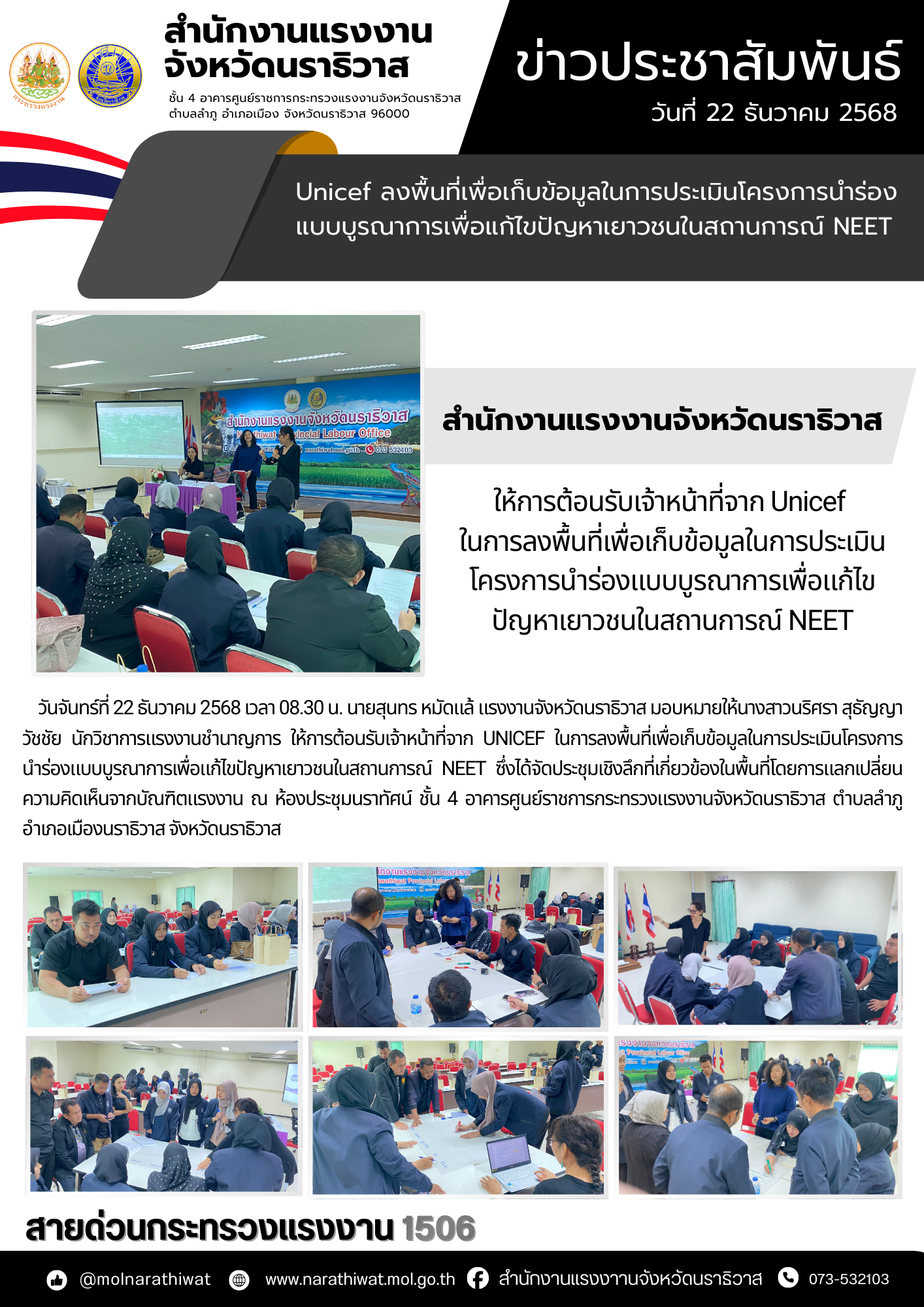 วันจันทร์ที่ 22 ธันวาคม 2568 เวลา 08.30 น. นายสุนทร หมัดแล้ แรงงานจังหวัดนราธิวาส มอบหมายให้นางสาวนริศรา สุธัญญาวัชชัย นักวิชาการแรงงานชำนาญการ ให้การต้อนรับเจ้าหน้าที่จาก Unicef ในการลงพื้นที่เพื่อเก็บข้อมูลในการประเมินโครงการนำร่องแบบบูรณาการเพื่อแก้ไขปัญหาเยาวชนในสถานการณ์ NEET ซึ่งได้จัดประชุมเชิงลึกที่เกี่ยวข้องในพื้นที่โดยการแลกเปลี่ยนความคิดเห็นจากบัณฑิตแรงงาน ณ ห้องประชุมนราทัศน์ ชั้น 4 อาคารศูนย์ราชการกระทรวงแรงงานจังหวัดนราธิวาส ตำบลลำภู อำเภอเมืองนราธิวาส จังหวัดนราธิวาส