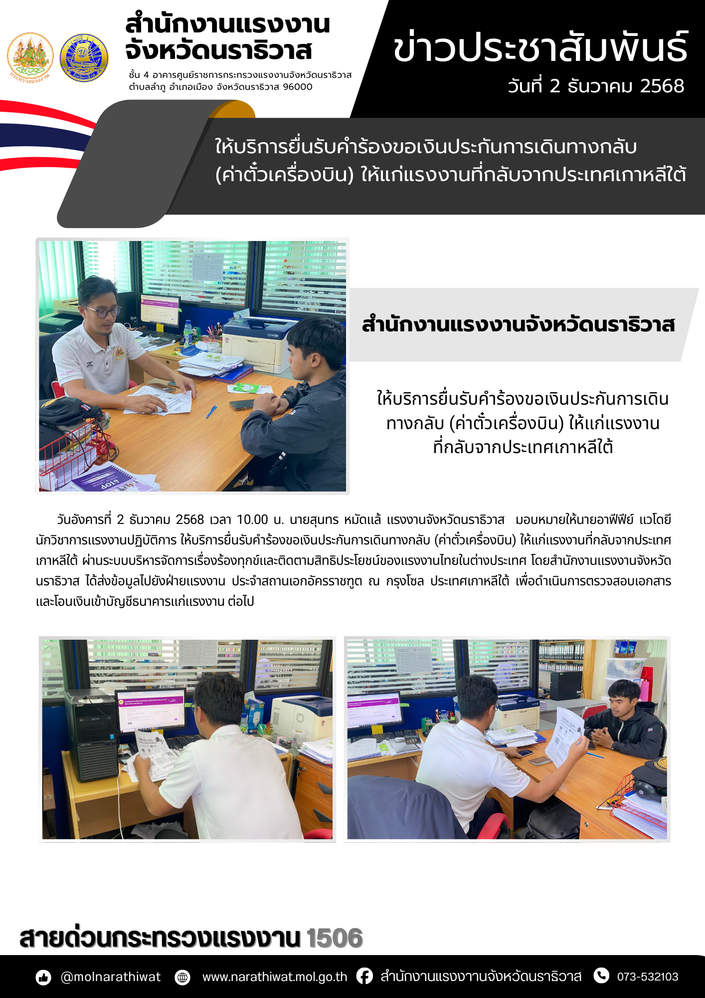 วันอังคารที่ 2 ธันวาคม 2568 เวลา 10.00 น. นายสุนทร หมัดแล้ แรงงานจังหวัดนราธิวาส มอบหมายให้นายอาฟีฟีย์ แวโดยี นักวิชาการแรงงานปฏิบัติการ ให้บริการยื่นรับคำร้องขอเงินประกันการเดินทางกลับ (ค่าตั๋วเครื่องบิน) ให้แก่แรงงานที่กลับจากประเทศเกาหลีใต้ ผ่านระบบบริหารจัดการเรื่องร้องทุกข์และติดตามสิทธิประโยชน์ของแรงงานไทยในต่างประเทศ โดยสำนักงานแรงงานจังหวัดนราธิวาส ได้ส่งข้อมูลไปยังฝ่ายแรงงาน ประจำสถานเอกอัครราชฑูต ณ กรุงโซล ประเทศเกาหลีใต้ เพื่อดำเนินการตรวจสอบเอกสาร และโอนเงินเข้าบัญชีธนาคารแก่แรงงาน ต่อไป