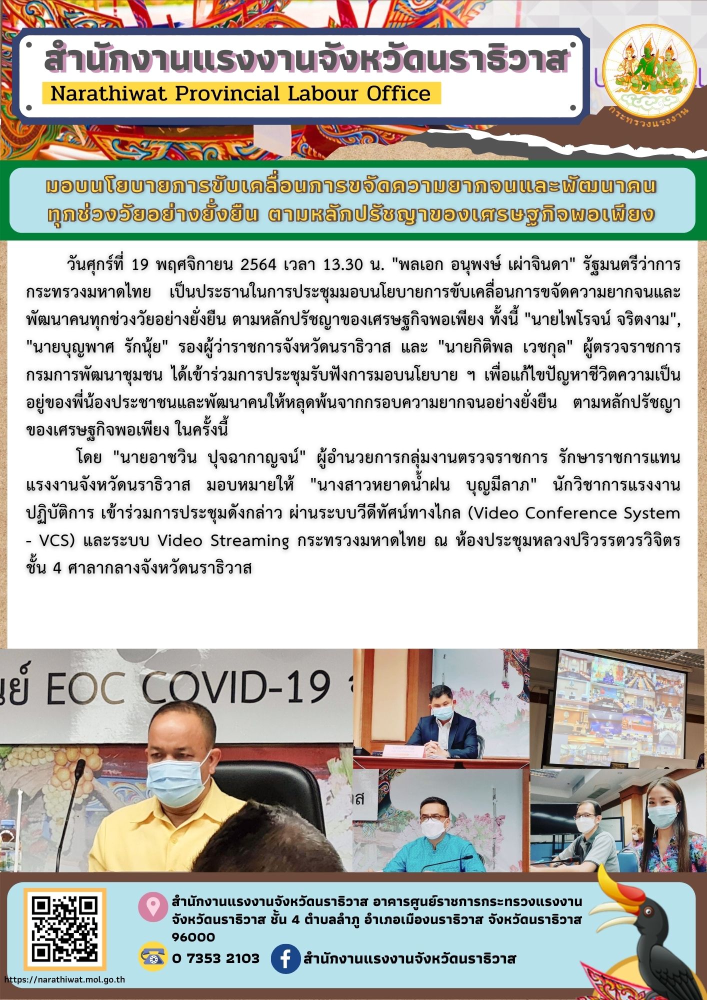 วันศุกร์ที่ 19 พฤศจิกายน 2564 เวลา 13.30 น. “พลเอก อนุพงษ์ เผ่าจินดา” รัฐมนตรีว่าการกระทรวงมหาดไทย เป็นประธานในการประชุมมอบนโยบายการขับเคลื่อนการขจัดความยากจนและพัฒนาคนทุกช่วงวัยอย่างยั่งยืน ตามหลักปรัชญาของเศรษฐกิจพอเพียง ทั้งนี้ “นายไพโรจน์ จริตงาม”, “นายบุญพาศ รักนุ้ย” รองผู้ว่าราชการจังหวัดนราธิวาส และ “นายกิติพล เวชกุล” ผู้ตรวจราชการกรมการพัฒนาชุมชน ได้เข้าร่วมการประชุมรับฟังการมอบนโยบาย ฯ เพื่อแก้ไขปัญหาชีวิตความเป็นอยู่ของพี่น้องประชาชนและพัฒนาคนให้หลุดพ้นจากกรอบความยากจนอย่างยั่งยืน ตามหลักปรัชญาของเศรษฐกิจพอเพียง ในครั้งนี้