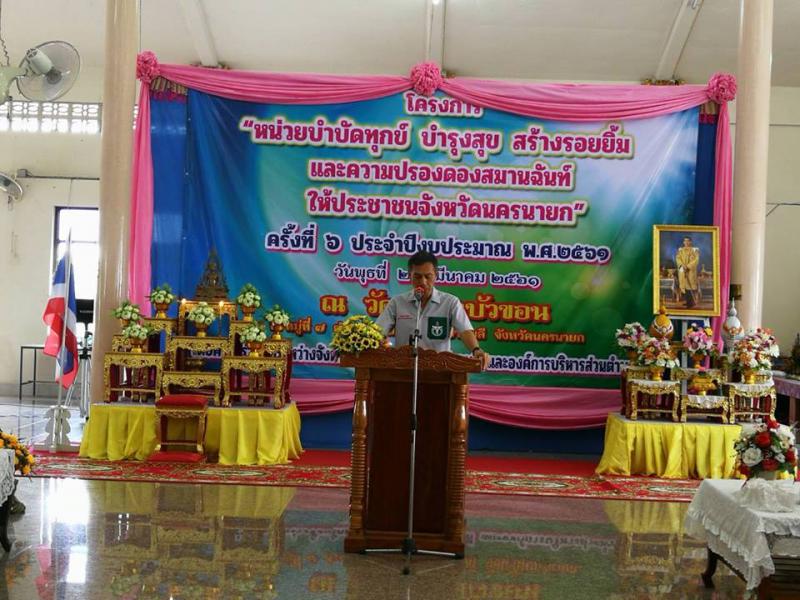 เมื่อวันที่ 21 มีนาคม 2561 เวลา 14.00 น. นายสมชาย เอื้อจารุพร แรงงานจังหวัดนครนายก ได้มอบหมายให้ จ่าสิบเอกปรีชา จันทร์ศรี นักวิชาการแรงงานชำนาญการ บูรณาการกับหัวหน้าส่วนราชการสังกัดกระทรวงแรงงาน ร่วมออกหน่วยเคลื่อนที่บริการด้านแรงงงาน ณ วัดหนองบัวขอน หมู่ที่ 7 ตำบลปากพลี อำเภอปากพลี จังหวัดนครนายก โดยมีผู้ว่าราชการจังหวัดนครนายก (นายณัฐพงศ์ ศิริชนะ) ได้ลงตรวจเยี่ยมและมอบเงินเบี้ยเลี้ยง แก่ผู้เข้าร่วมโครงการแก้ไขปัญหาความเดือดร้อนด้านอาชีพ จำนวน 48 คน