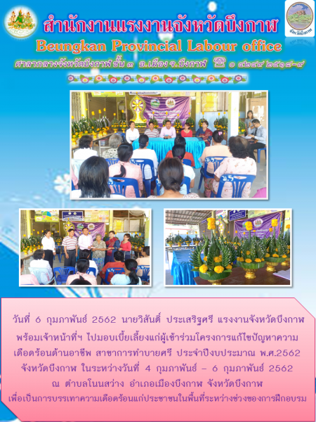 สำนักงานแรงงานจังหวัดบึงกาฬ จ่ายเบี้ยเลี้ยงผู้เข้าร่วมฝึกอบรมโครงการแก้ไขปัญหาความเดือดร้อนด้านอาชีพ ปีงบประมาณ 2562 สาขาการทำบายศรี