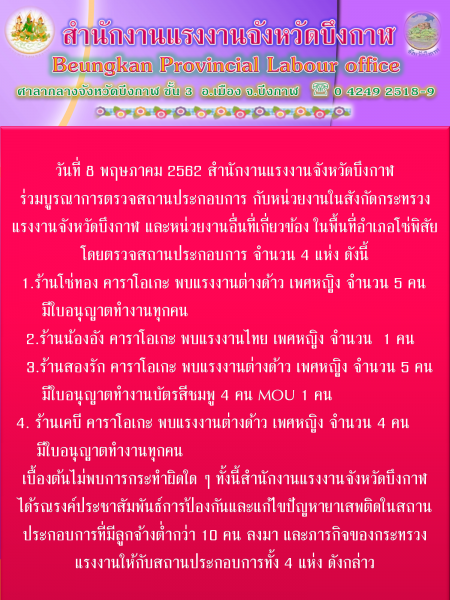 สำนักงานแรงงานจังหวัดบึงกาฬ ร่วมตรวจสถานประกอบการ กับหน่วยงานในสังกัดกระทรวงแรงงานจังหวัดบึงกาฬ และหน่วยงานที่เกี่ยวข้อง ในพื้นที่อำเภอโซ่พิสัย จังหวัดบึงกาฬ