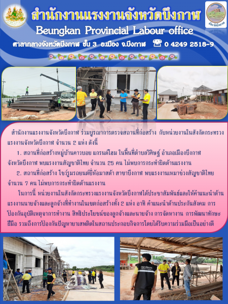 สำนักงานแรงงานจังหวัดบึงกาฬ ร่วมบูรณาการตรวจสถานที่ก่อสร้าง ในพื้นที่อำเภอเมือง