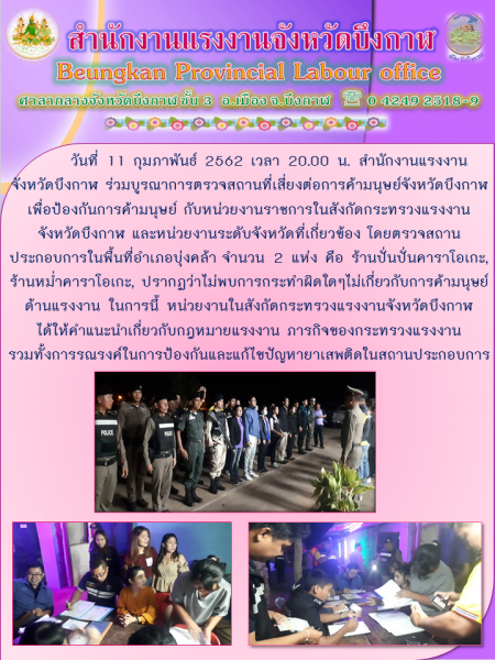 สำนักงานแรงงานจังหวัดบึงกาฬ ร่วมออกตรวจตราสถานที่เสี่ยงต่อการค้ามนุษย์จังหวัดบึงกาฬ อำเภอบุ่งคล้า