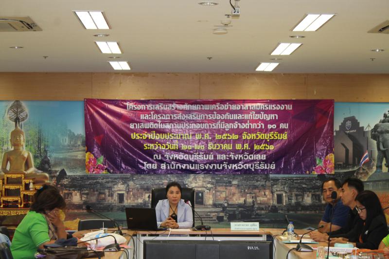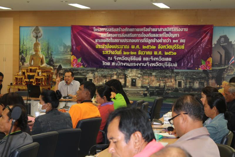 สำนักงานแรงงานจังหวัดบุรีรัมย์ จัดประชุมโครงการเสริมสร้างศักยภาพเครือข่ายอาสาสมัครแรงงานและโครงการส่งเสริมการป้องกันและแก้ไขปัญหายาเสพติดในสถานประกอบการที่มีลูกจ้างต่ำกว่า ๑๐ คน ประจำปีงบประมาณ พ.ศ.๒๕๖๒ จังหวัดบุรีรัมย์ และศึกษาดูงาน ณ จังหวัดเลย