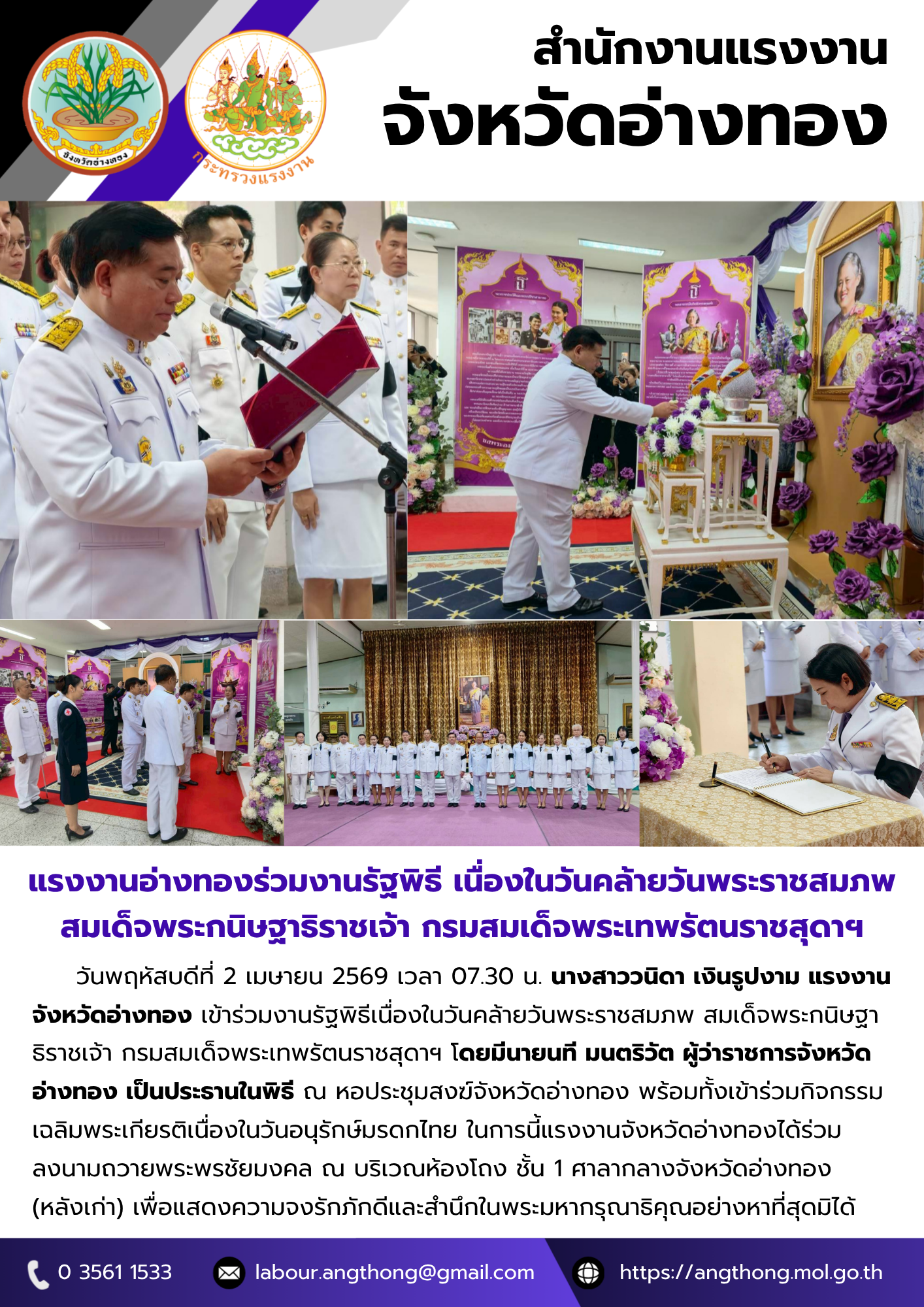แรงงานอ่างทองร่วมงานรัฐพิธี เนื่องในวันคล้ายวันพระราชสมภพสมเด็จพระกนิษฐาธิราชเจ้า กรมสมเด็จพระเทพรัตนราชสุดาฯ