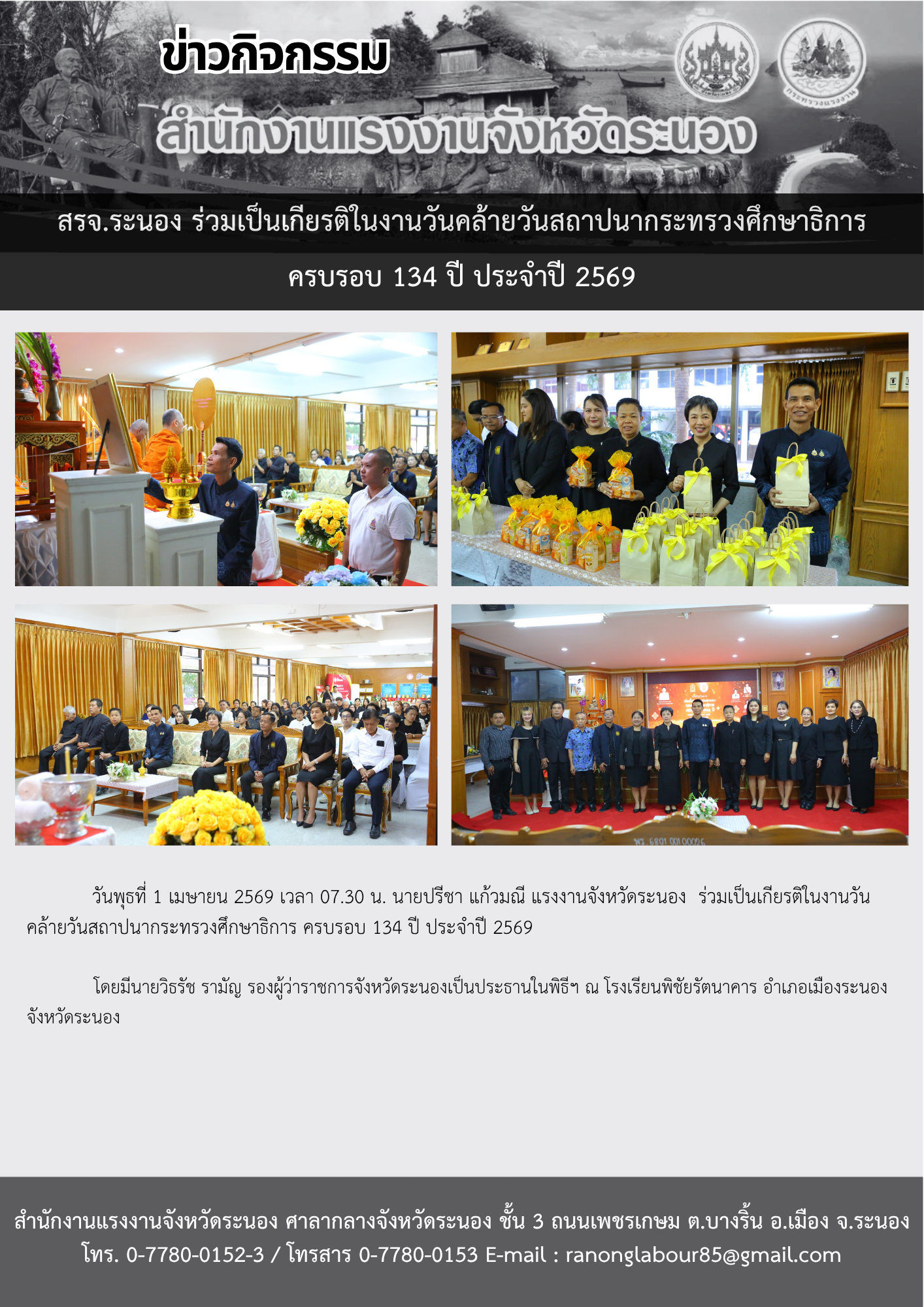สรจ.ระนอง ร่วมเป็นเกียรติในงานวันคล้ายวันสถาปนากระทรวงศึกษาธิการครบรอบ 134 ปี ประจำปี 2569