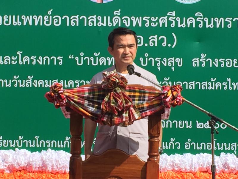 เมื่อวันศุกร์ที่ 24 พฤศจิกายน 2560 เวลา 09.00 น. นายอนุสรณ์ แก้วกังวาล ผู้ว่าราชการจังหวัดบุรีรัมย์ เป็น่ประธานออกหน่วยแพทย์อาสาสมเด็จพระศรีนครินทราบรมราชชนนี (พอ.สว.) และโครงการ "บำบัดทุกข์ บำรุงสุข สร้างรอยยิ้มให้ประชาชน" ประจำเดือนพฤศจิกายน 2560 ณ โรงเรียนบ้านโกรกแก้ว หมู่ 4 ตำบลโกรกแก้ว อำเภอโนนสุวรรณ จังหวัดบุรีรัมย์ ซึ่งสำนักงานแรงงานจังหวัดบุรีรัมย์ ได้นำกล่องข้าว กระบอกน้ำ และสมุดฉีก ไปแจกให้กับประชาชนที่มารับบริการด้วย