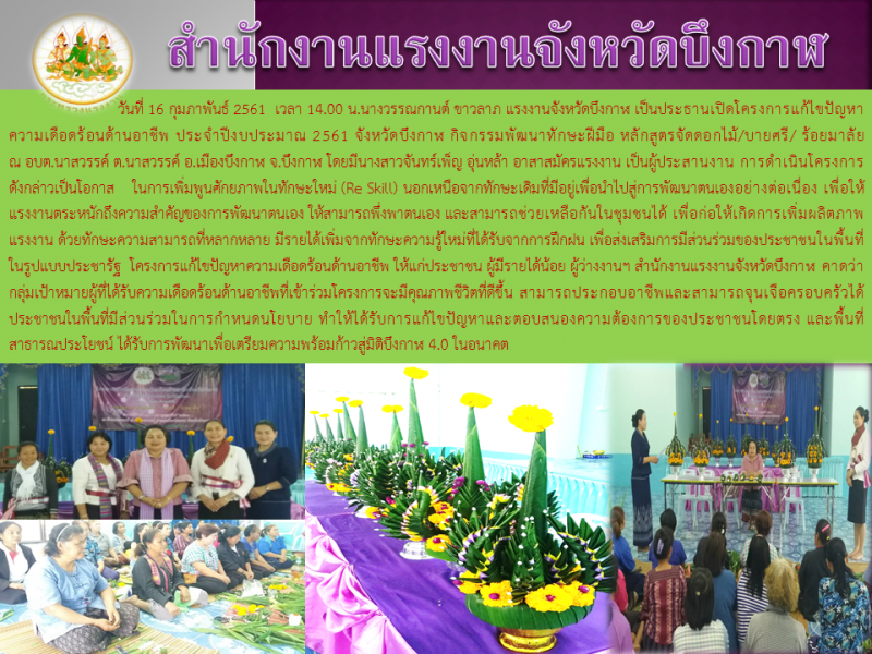 สำนักงานแรงงานจังหวัดบึงกาฬจัดโครงการแก้ไขปัญหาความเดือดร้อนด้านอาชีพ ประจำปีงบประมาณ 2561