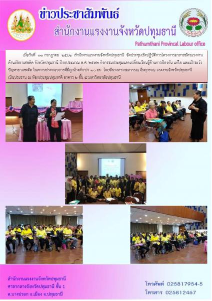 สำนักงานแรงงานจังหวัดปทุมธานี จัดประชุมเชิงปฏิบัติการโครงการอาสาสมัครแรงงานต้านภัยยาเสพติด จังหวัดปทุมธานี ปีงบประมาณ พ.ศ. 2562
