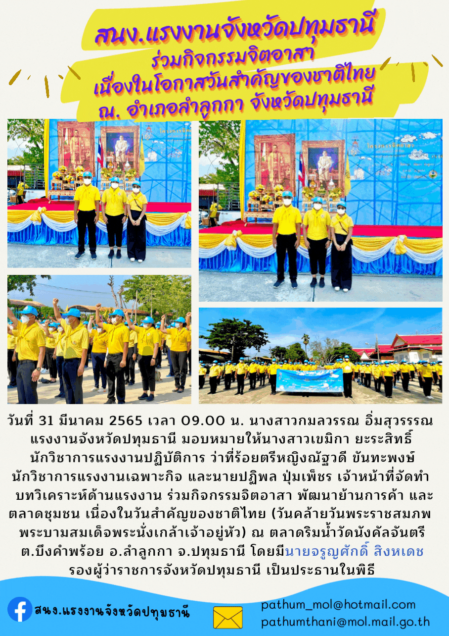 สำนักงานแรงงานจังหวัดปทุมธานี ร่วมกิจกรรมจิตอาสาในวันสำคัญของชาติไทย ณ วัดนังคัลจันตรี อ.ลำลูกกา จ.ปทุมธานี