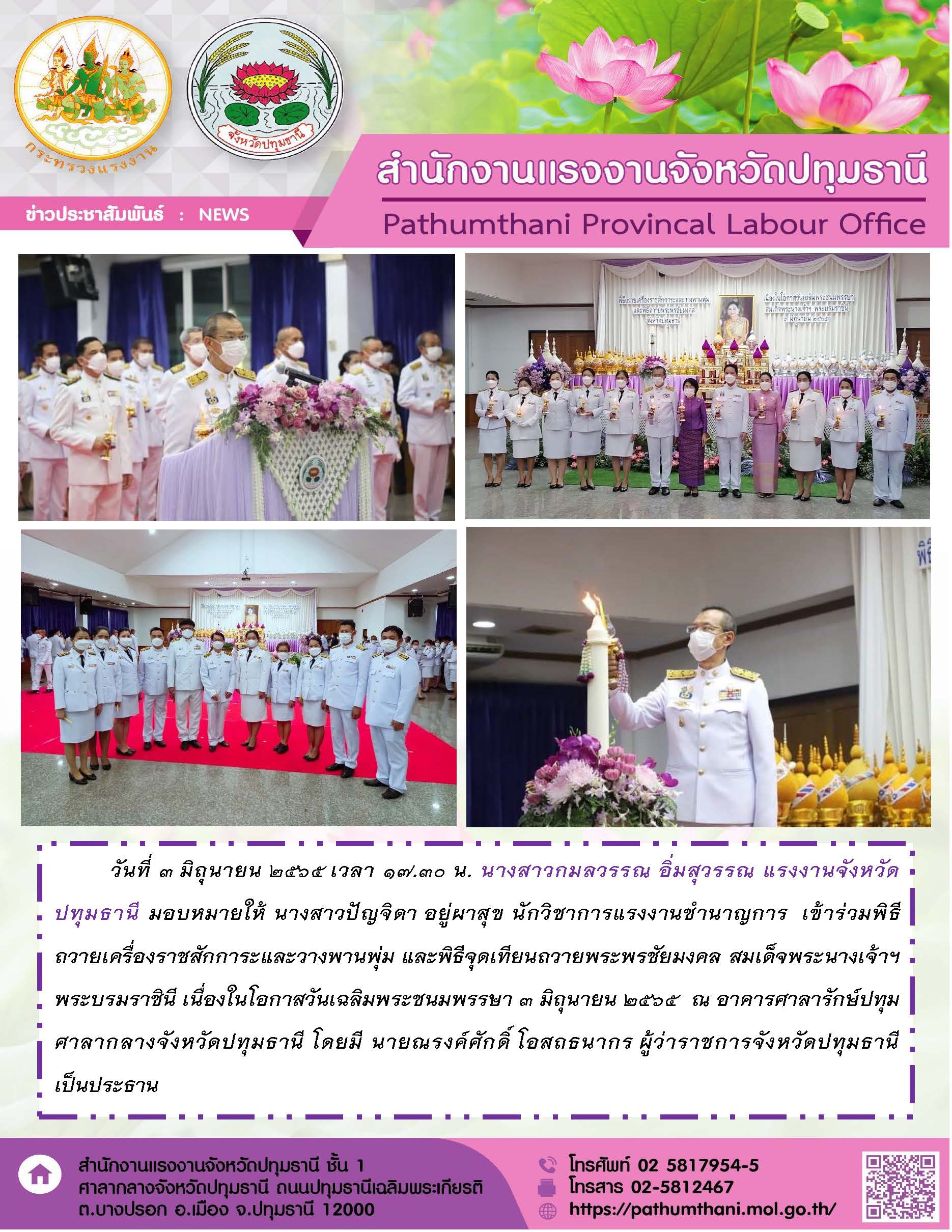 สำนักงานแรงงานจังหวัดปทุมธานี ร่วมพิธีถวายเครื่องราชสักการะและวางพานพุ่มและพิธีจุดเทียนถวายพระพรชัยมงคล สมเด็จพระนางเจ้าฯ พระบรมราชินี