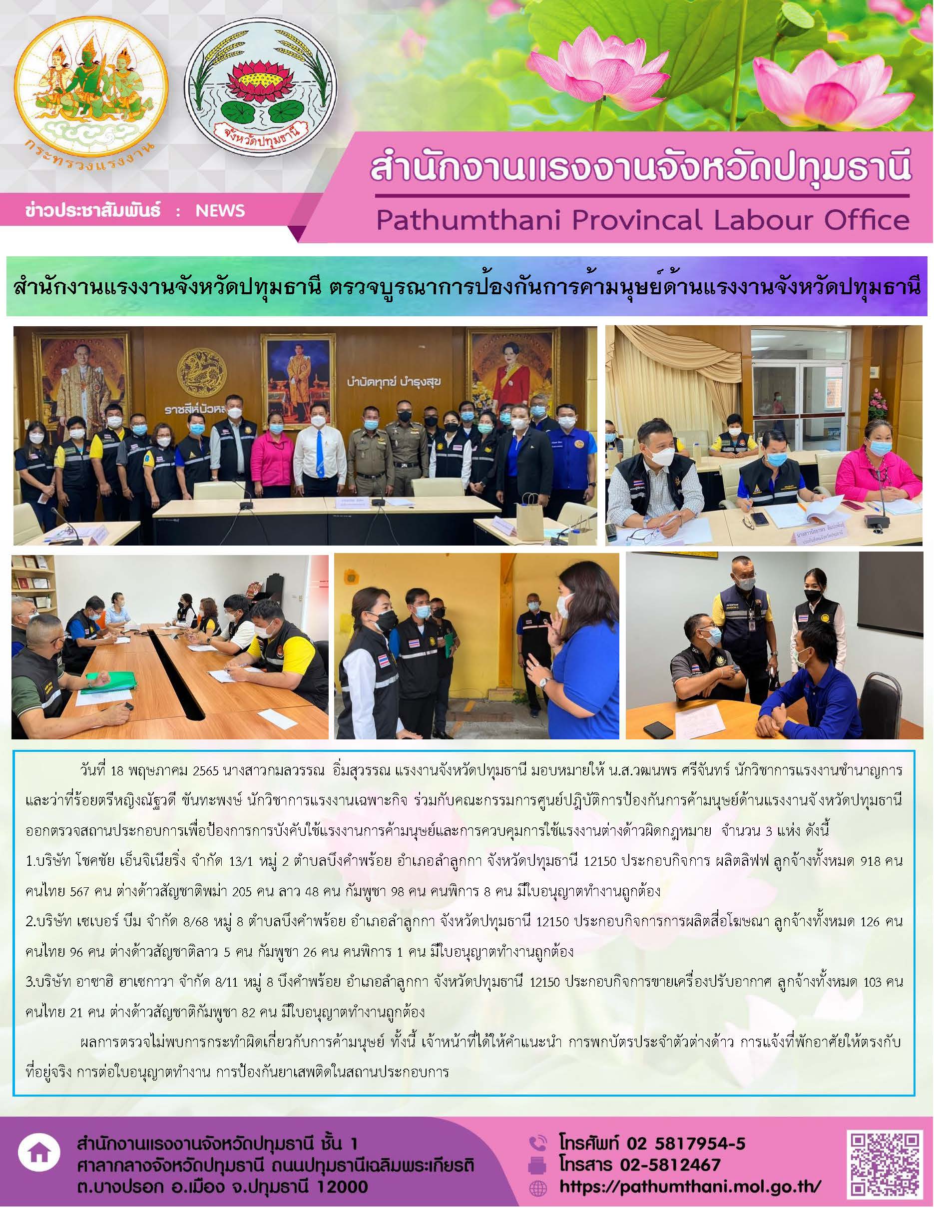 สำนักงานแรงงานจังหวัดปทุมธานี ลงพื้นที่ตรวจบูรณาการป้องกันการค้ามนุษย์ด้านแรงงานจังหวัดปทุมธานี ในพื้นที่อำเภอลำลูกกา