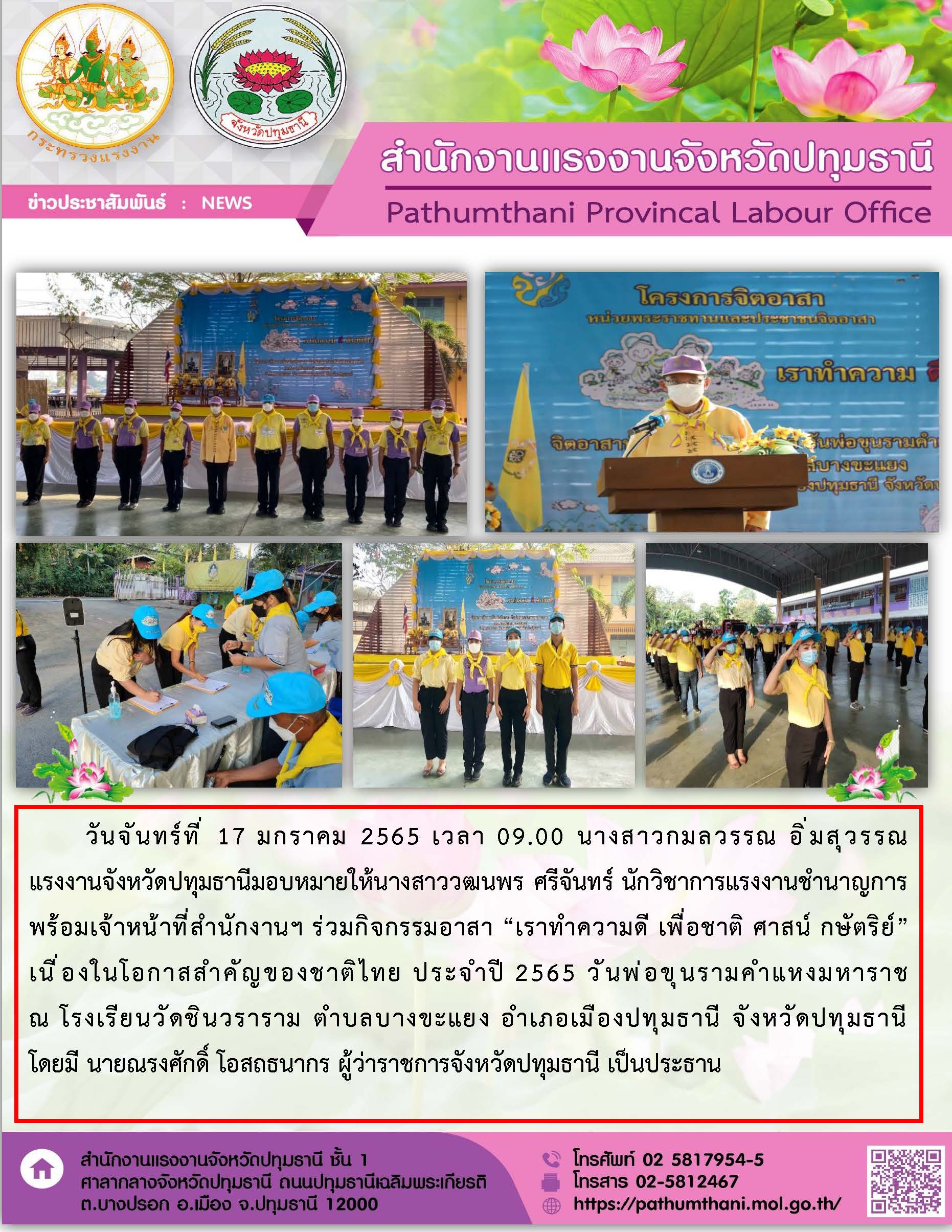 สำนักงานแรงงานจังหวัดปทุมธานี เข้าร่วมกิจกรรมจิตอาสา ”ทำดีเพื่อชาติ ศาสน์ กษัตริย์” ณ โรงเรียนวัดชินวนาราม อ.เมืองฯ จ.ปทุมธานี