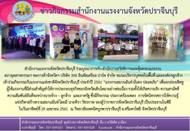 สำนักงานแรงงานจังหวัดปราจีนบุรี ร่วมบูรณาการกับ สำนักงานสวัสดิการและคุ้มครองแรงงาน สภาอุตสาหกรรมฯ หอการค้าจังหวัดฯ บริษัท 304 อินดัสเตรียล ปาร์ค จำกัด ชมรมบริหารบุคคลในพื้นที่ และองค์กรลูกจ้าง เข้าร่วมกิจกรรมวันแรงงานแห่งชาติจังหวัดปราจีนบุรี ประจำปี 2561