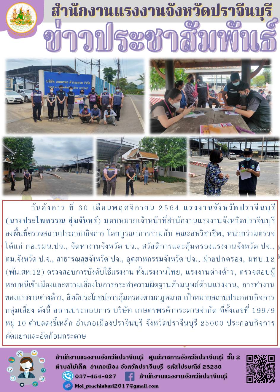 วันอังคาร ที่ 30 เดือนพฤศจิกายน 2564 แรงงานจังหวัดปราจีนบุรี (นางประไพพรรณ ลุ่มจันทร์) มอบหมายเจ้าหน้าที่สำนักงานแรงงานจังหวัดปราจีนบุรี ลงพื้นที่ตรวจสถานประกอบกิจการ โดยบูรณาการร่วมกับ คณะสหวิชาชีพ, หน่วยร่วมตรวจได้แก่ กอ.รมน.ปจ., จัดหางานจังหวัด ปจ., สวัสดิการและคุ้มครองแรงงานจังหวัด ปจ., ตม.จังหวัด ป.จ., สาธารณสุขจังหวัด ปจ., อุตสาหกรรมจังหวัด ปจ., ฝ่ายปกครอง, มทบ.12 (พัน.สห.12) ตรวจสอบการบังคับใช้แรงงาน ทั้งแรงงานไทย, แรงงานต่างด้าว, ตรวจสอบผู้หลบหนีเข้าเมืองและความเสี่ยงในการกระทำความผิดฐานค้ามนุษย์ด้านแรงงาน, การทำงานของแรงงานต่างด้าว, สิทธิประโยชน์การคุ้มครองตามกฎหมาย เป้าหมายสถานประกอบกิจการกลุ่มเสี่ยง ดังนี้ สถานประกอบการ บริษัท เกษตรพรค้ากระดาษจำกัด ที่ตั้งเลขที่ 199/9 หมู่ 10 ตำบลดงขี้เหล็ก อำเภอเมืองปราจีนบุรี จังหวัดปราจีนบุรี 25000 ประกอบกิจการ คัดแยกและอัดก้อนกระดาษ