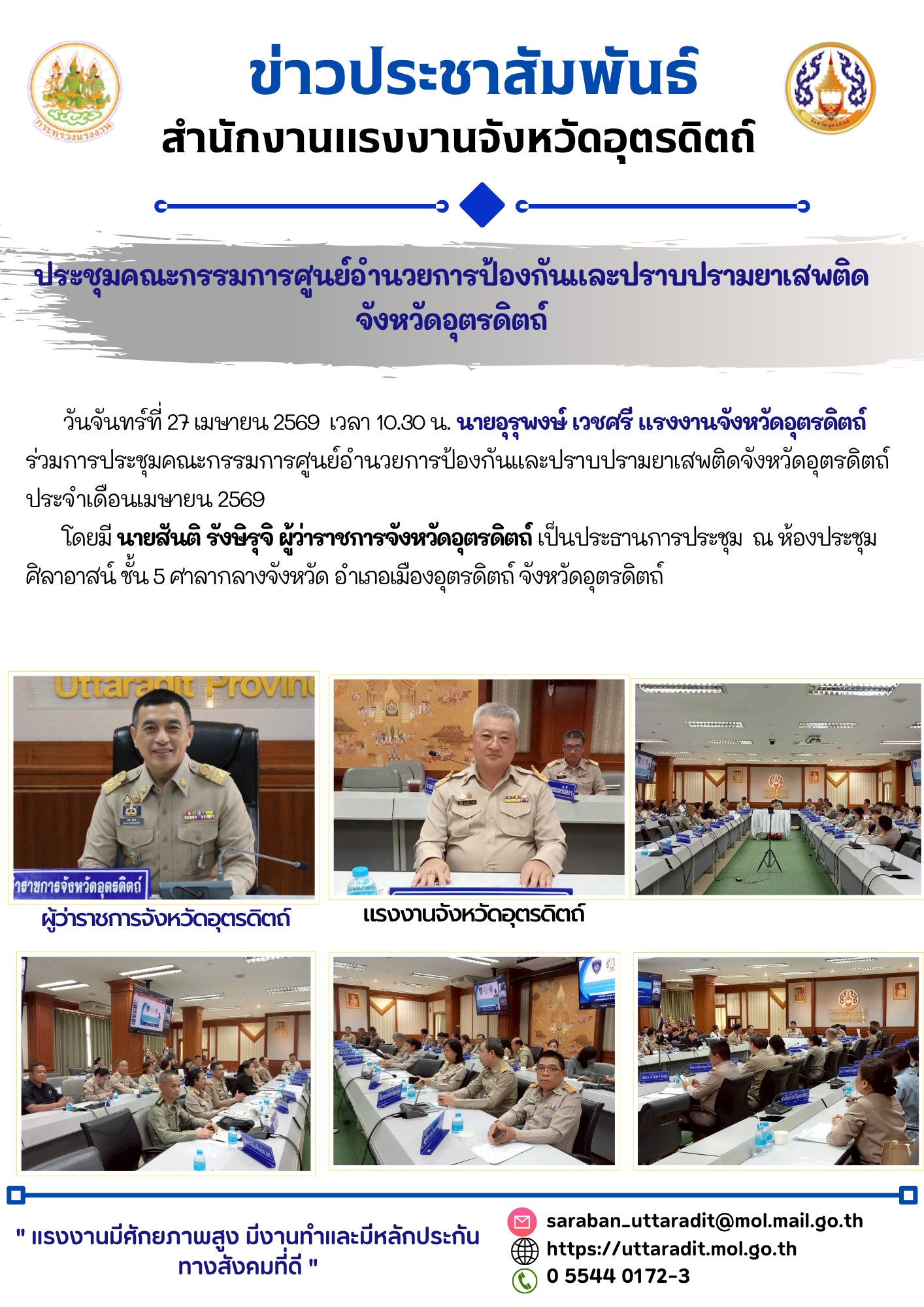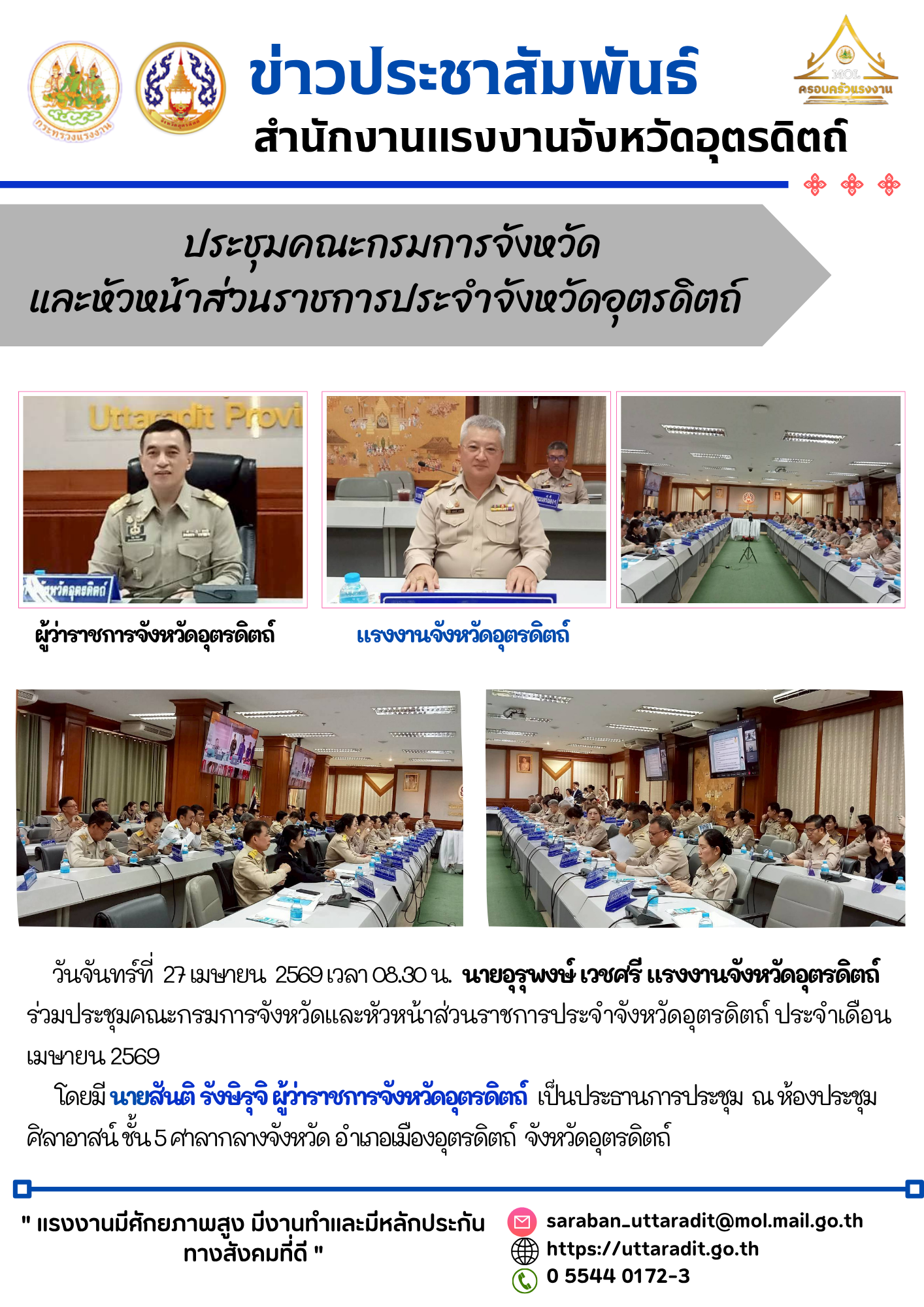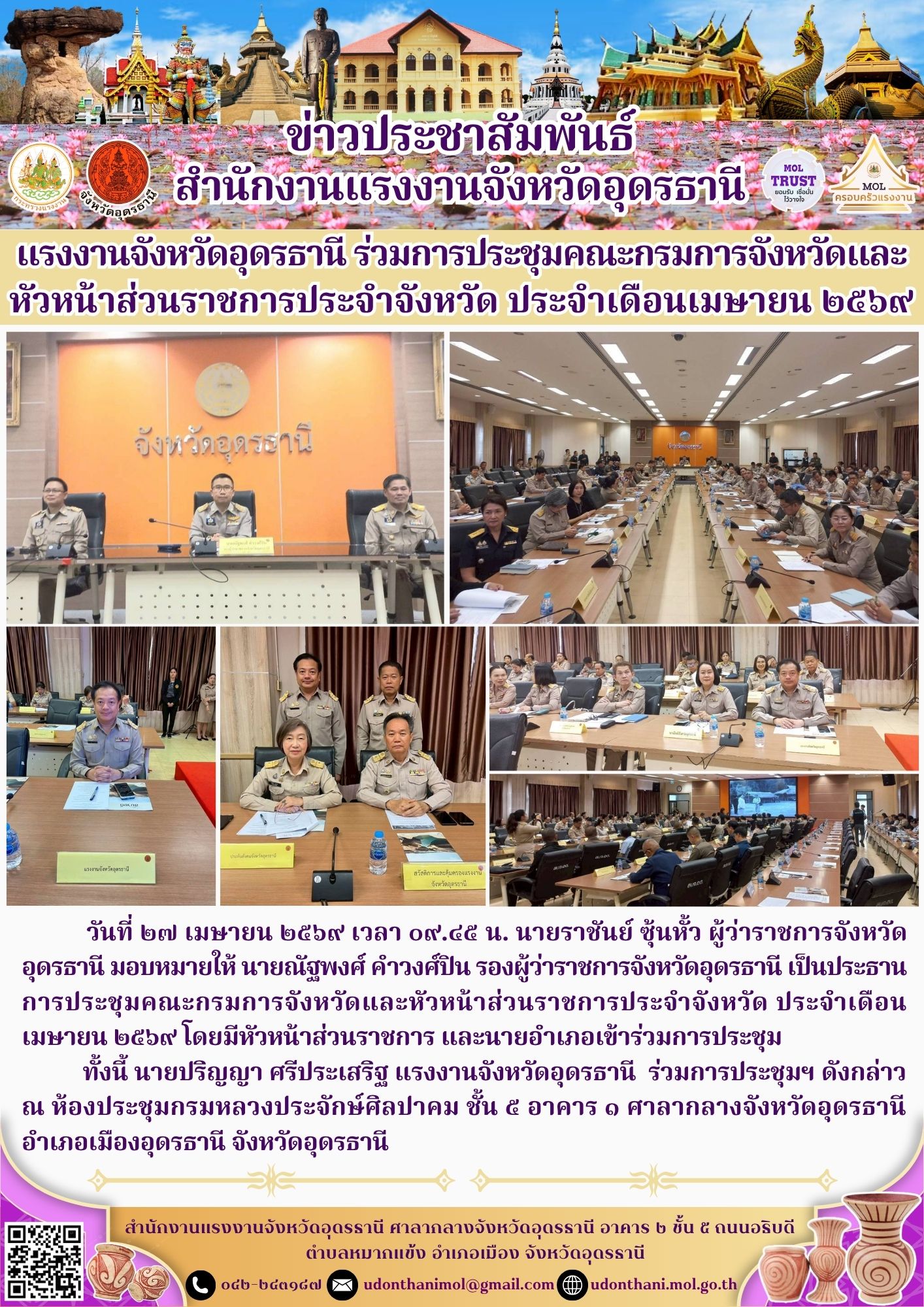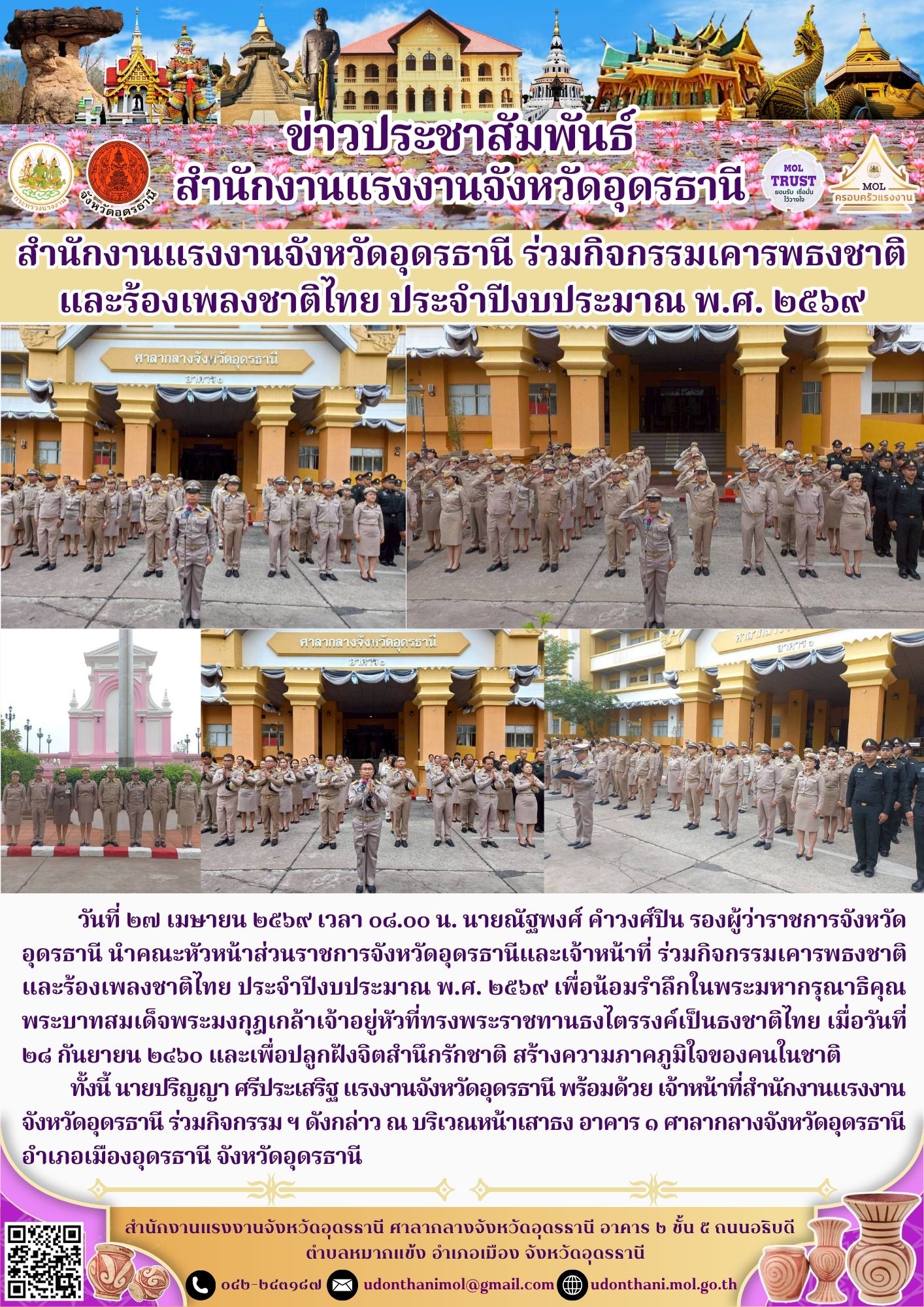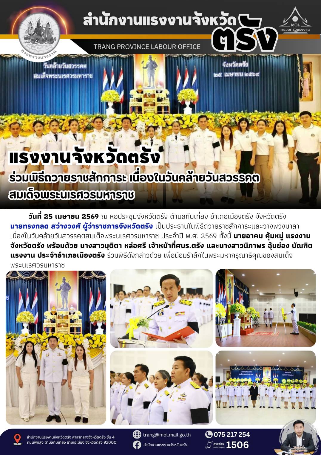 วันที่ 25 เมษายน 2569 เวลา 07.00 น. นางสาวรุ่งทิพย์ จั่นทอง แรงงานจังหวัดพระนครศรีอยุธยา มอบหมายให้นางสาวสุภาพันธ์ รัชวิชัย เจ้าหน้าที่บริหารงานทั่วไป เข้าร่วมพิธีวันคล้ายวันสวรรคต “สมเด็จพระนเรศวรมหาราช” ประจำปี 2569 นายชวนินทร์ วงศ์สถิตจิรกาล ผู้ว่าราชการจังหวัดพระนครศรีอยุธยา เป็นประธานในพิธี เพื่อน้อมรำลึกถึงพระมหากรุณาธิคุณและพระวีรกรรมของสมเด็จพระนเรศวรมหาราช ที่ทรงกอบกู้เอกราชของชาติ ปกป้องแผ่นดินไทยจากอริราชศัตรูทรงประกาศอิสรภาพ และทรงสร้างความมั่นคงให้แก่บ้านเมือง รวมถึงทรงมีพระปรีชาสามารถด้านการเมือง การปกครอง และการค้าระหว่างประเทศ อันนำมาซึ่งความมั่งคั่งและความสงบสุขแก่กรุงศรีอยุธยา ณ พระบรมราชานุสาวรีย์สมเด็จพระนเรศวรมหาราช บริเวณทุ่งภูเขาทอง ตำบลภูเขาทอง อำเภอพระนครศรีอยุธยา จังหวัดพระนครศรีอยุธยา