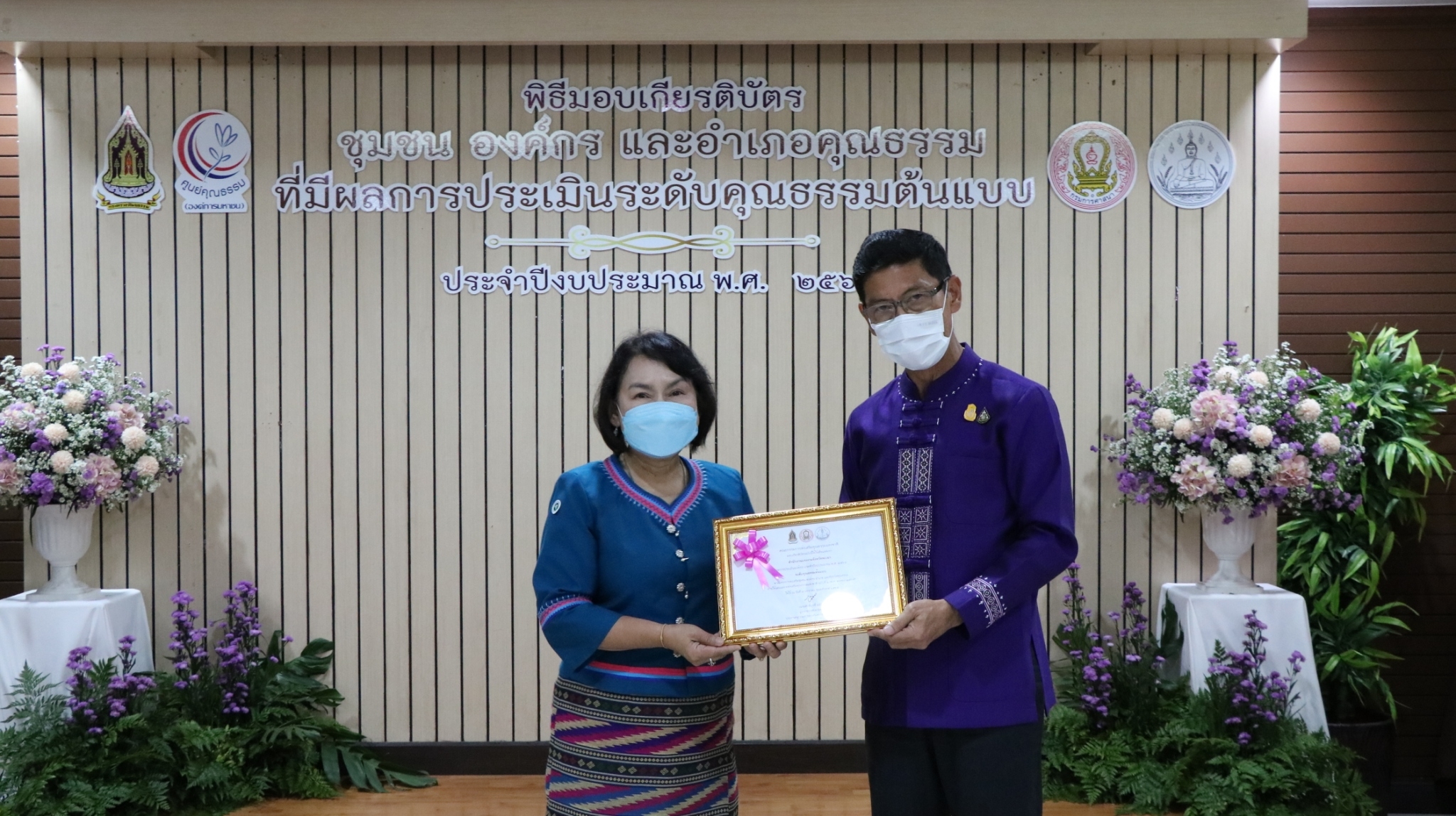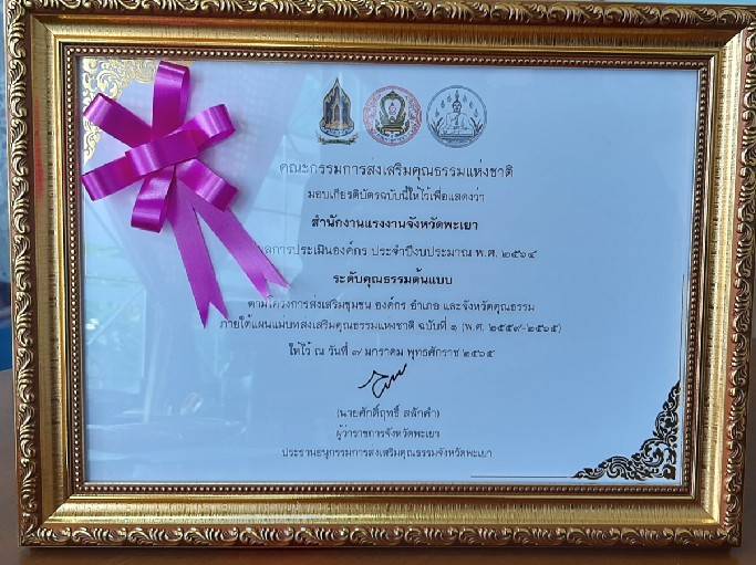สำนักงานแรงงานจังหวัดพะเยา ได้รับเกียรติบัตรชุมชน องค์กร และอำเภอคุณธรรม ที่มีผลการประเมินระดับ คุณธรรมต้นแบบ ประจำปีงบประมาณ พ.ศ. 2564