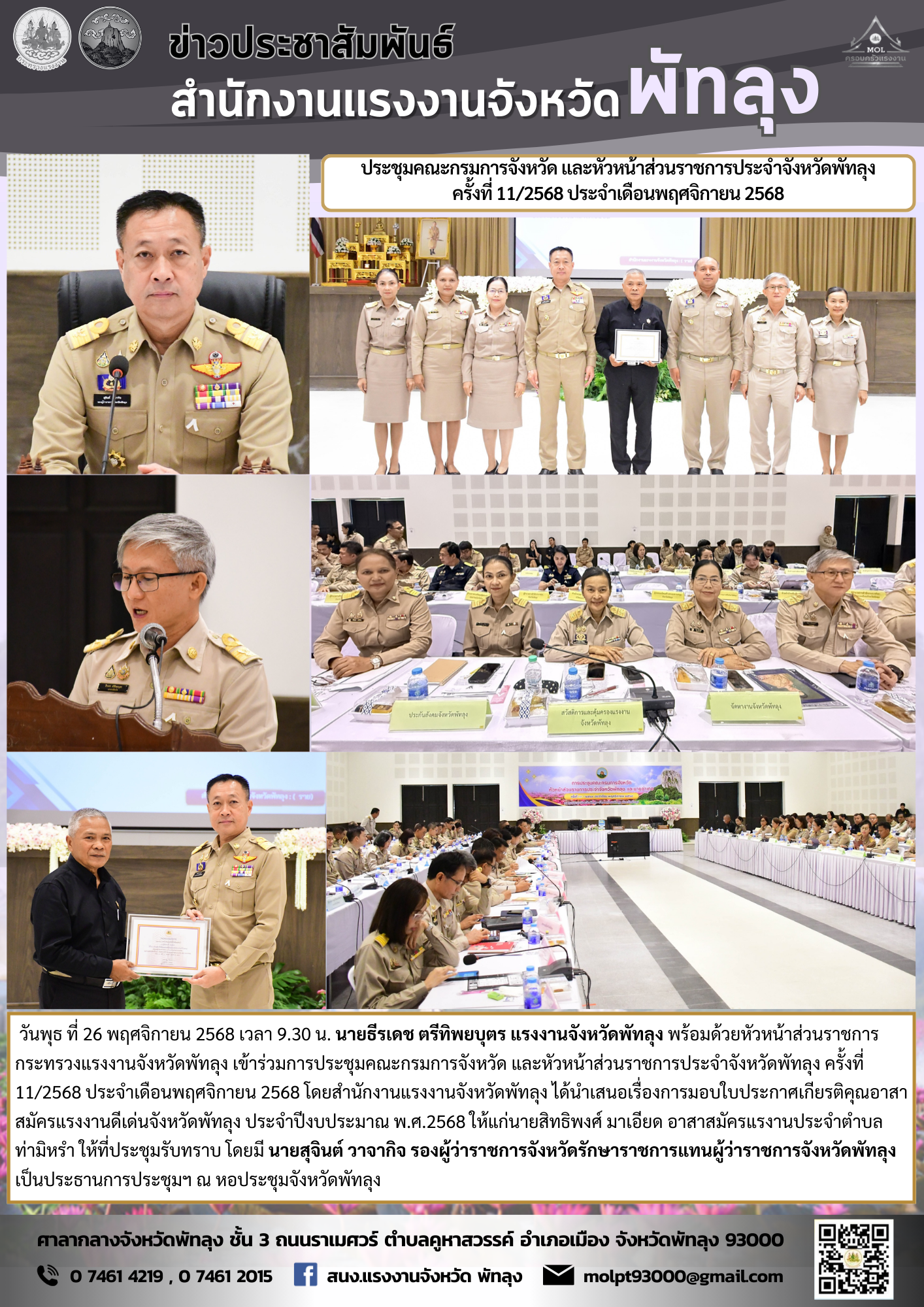 วันพุธ ที่ 26 พฤศจิกายน 2568 เวลา 9.30 น. นายธีรเดช ตรีทิพยบุตร แรงงานจังหวัดพัทลุง พร้อมด้วยหัวหน้าส่วนราชการกระทรวงแรงงานจังหวัดพัทลุง เข้าร่วมการประชุมคณะกรมการจังหวัด และหัวหน้าส่วนราชการประจำจังหวัดพัทลุง ครั้งที่ 11/2568 ประจำเดือนพฤศจิกายน 2568 โดยสำนักงานแรงงานจังหวัดพัทลุง ได้นำเสนอเรื่องการมอบใบประกาศเกียรติคุณอาสาสมัครแรงงานดีเด่นจังหวัดพัทลุง ประจำปีงบประมาณ พ.ศ.2568 ให้แก่นายสิทธิพงศ์ มาเอียด อาสาสมัครแรงานประจำตำบล ท่ามิหรำ ให้ที่ประชุมรับทราบ โดยมี นายสุจินต์ วาจากิจ รองผู้ว่าราชการจังหวัดรักษาราชการแทนผู้ว่าราชการจังหวัดพัทลุง เป็นประธานการประชุมฯ ณ หอประชุมจังหวัดพัทลุง